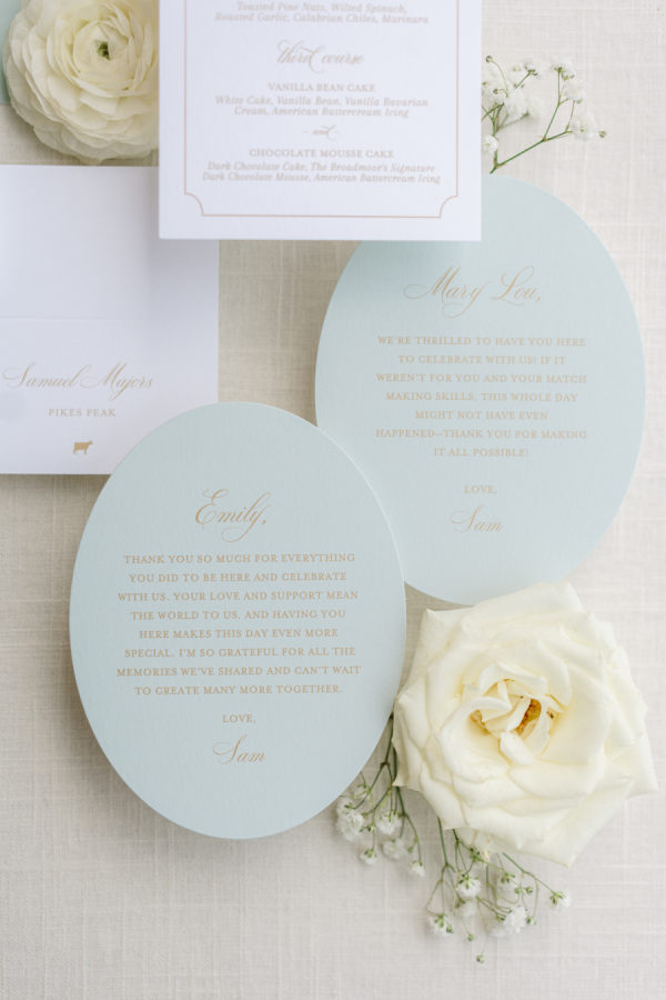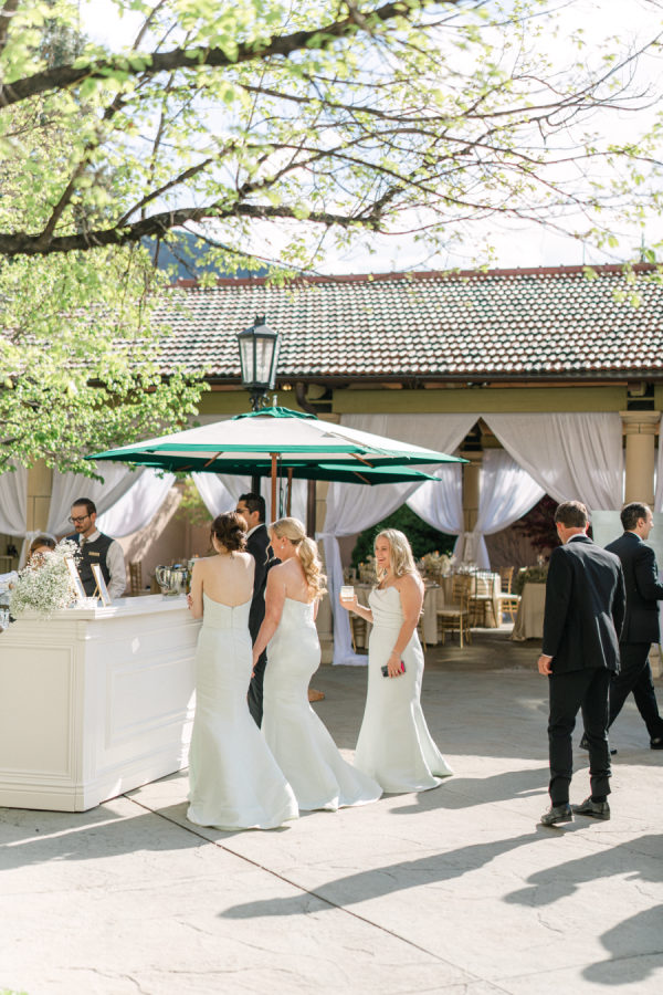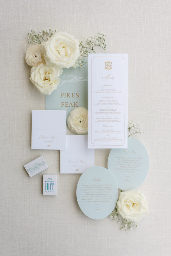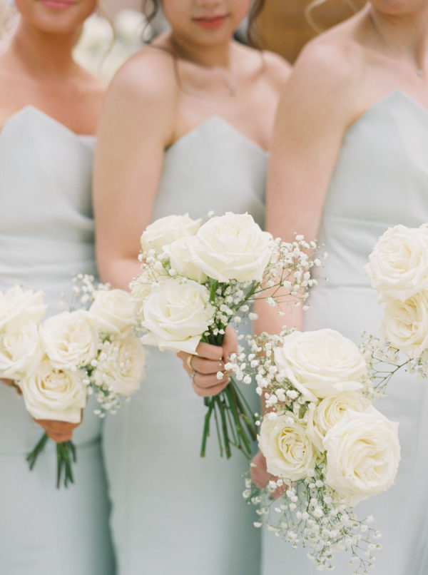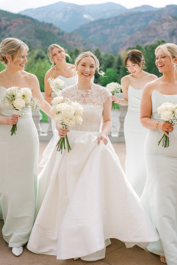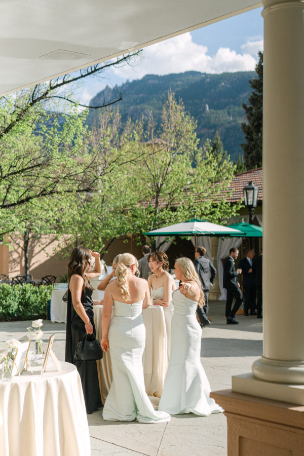 [field title=”Bridesmaid Dresses”]The bridesmaids wore light mint green Amsale dresses that brought a soft, serene palette to the day, fresh against the mountain backdrop and beautifully cohesive with the florals. The mother of the bride complemented the look in a jacquard-textured gown in a similar shade, adding an elevated touch with timeless texture and subtle shimmer.[/field]