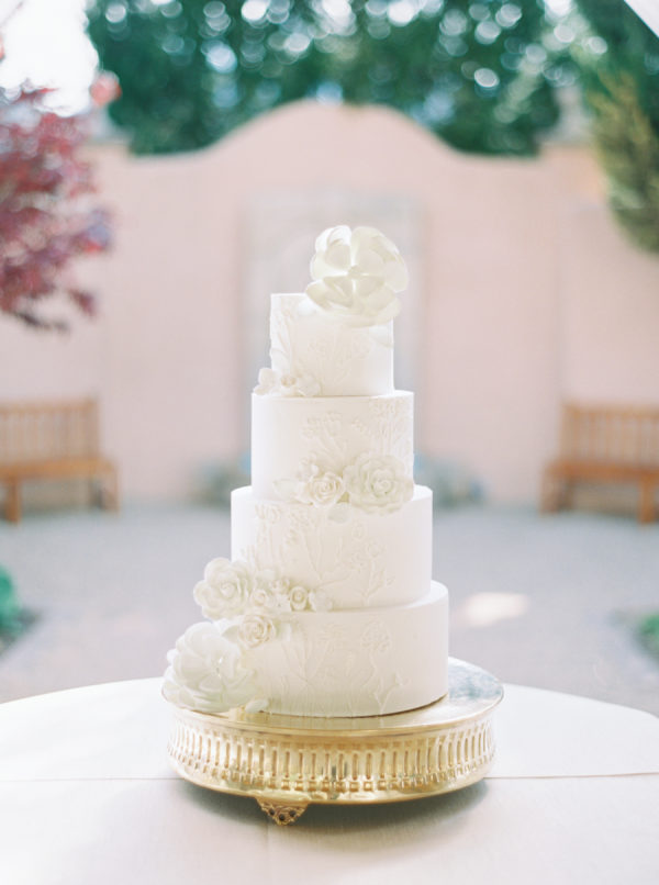[field title=”Wedding Cake”]The four-tiered wedding cake, created by The Broadmoor, was a stunning white confection, adorned with sculptural white sugar flowers that added a modern yet delicate touch. Its clean design perfectly complemented the day’s elegant and timeless aesthetic.[/field]
