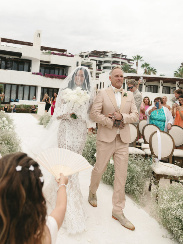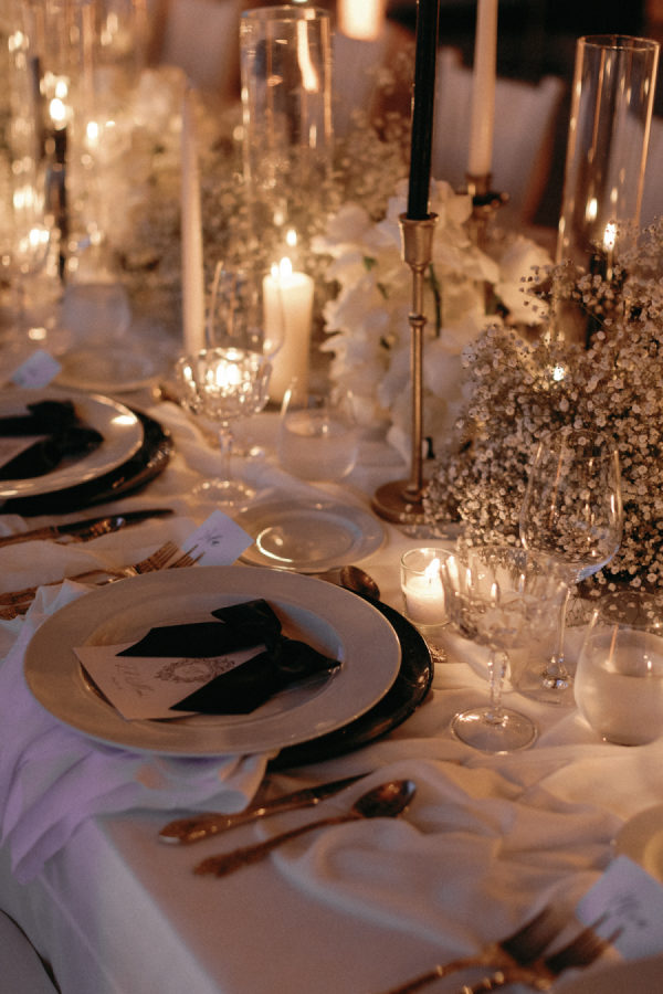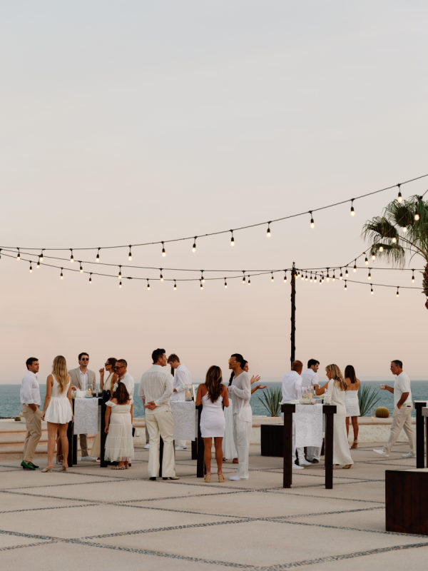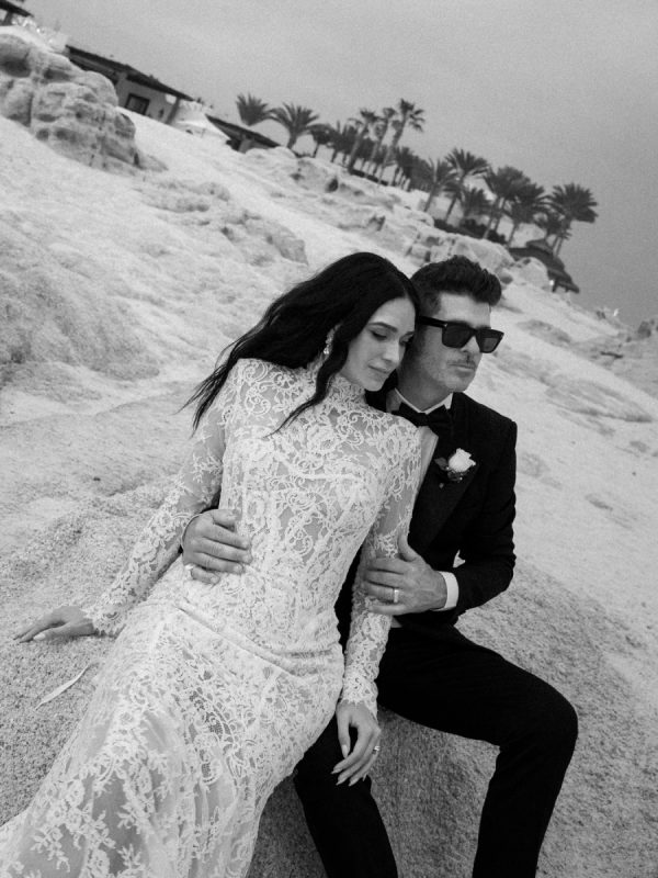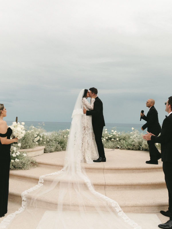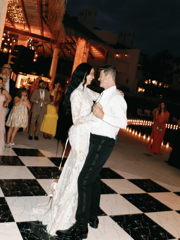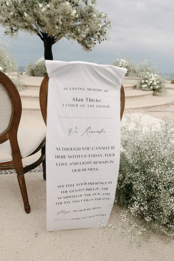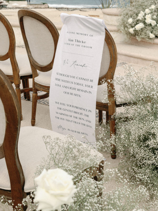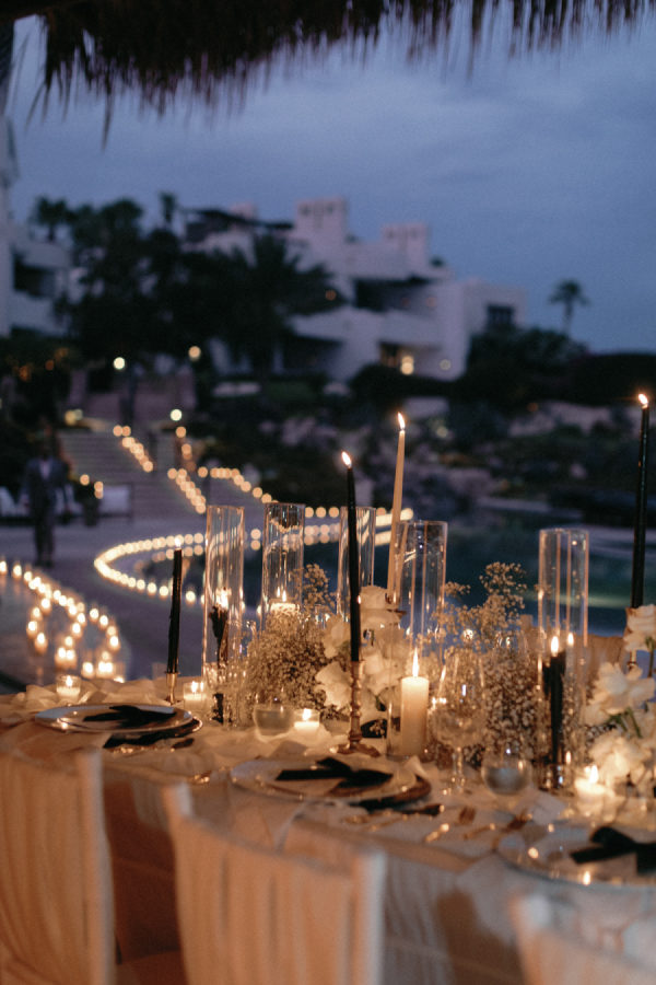 Robin and April love a clean, ethereal, and highly sophisticated aesthetic…so we presented a beautiful and bold event that reflected them as a couple and enhanced the beauty of the resort. Our bride’s love for black inspired a romantic contrast against the soft sand, creating a striking yin-yang harmony. Honeycomb Affair executed flawlessly the ethereal clouds of baby’s breath with delicate roses — one of her favorite flowers — to keep the look airy, clean, and intentional. The result: a bold yet dreamy setting where elegance meets edge, and softness dances with strength. We wanted to create with Honeycomb Affair and Cabo Linens things and more, gorgeous tables with endless depth of candles, flowy textiles, and our bride’s love for bows, topped off by our beautiful menu designed by Laura Elizabeth Patrick. Our day-of signage, created by Luxe and Linen, was crafted from beautiful marble, grounding the design with a sense of permanence and natural elegance. The stone’s timeless quality anchored the ethereal elements, creating a refined balance between softness and strength.