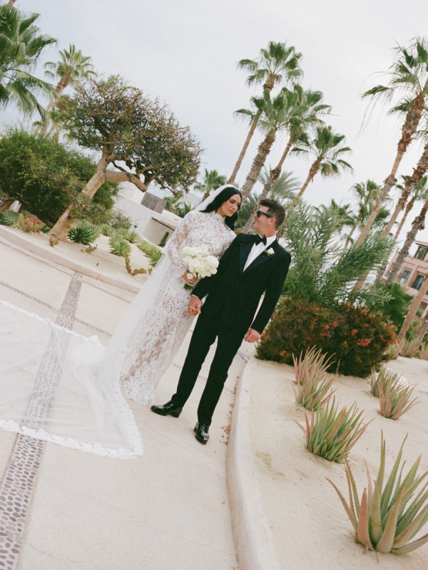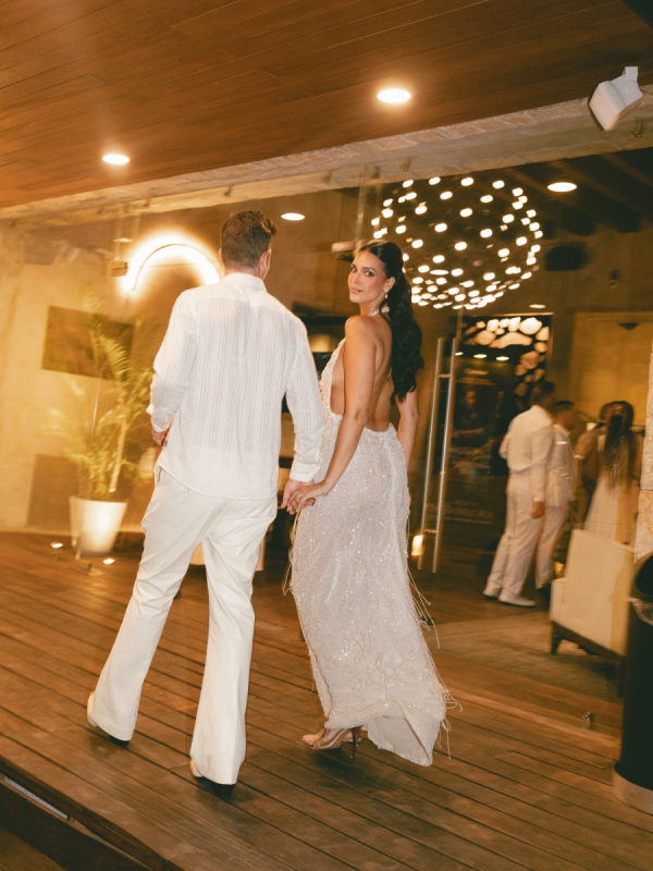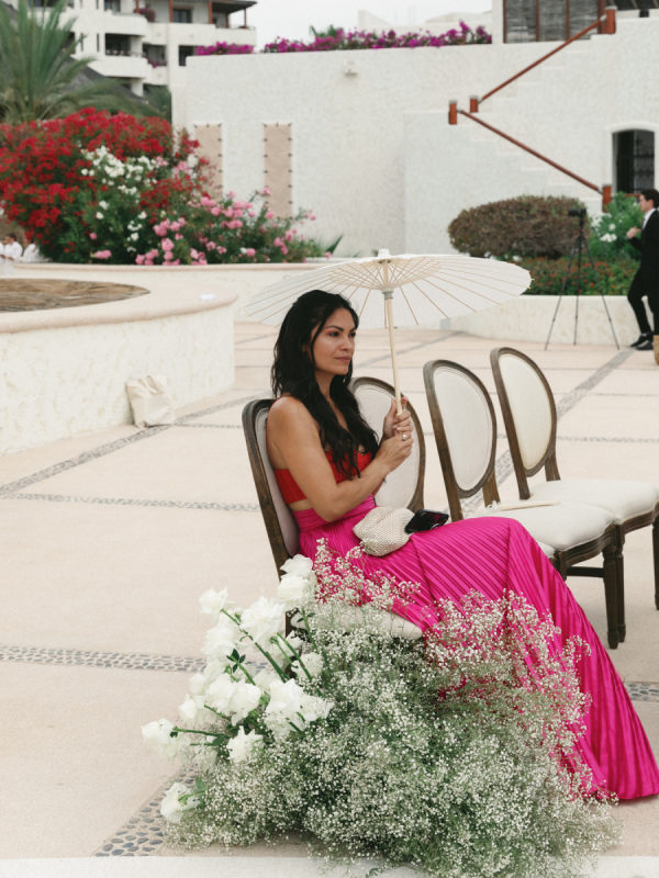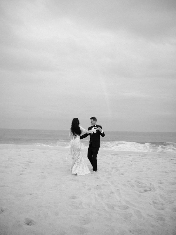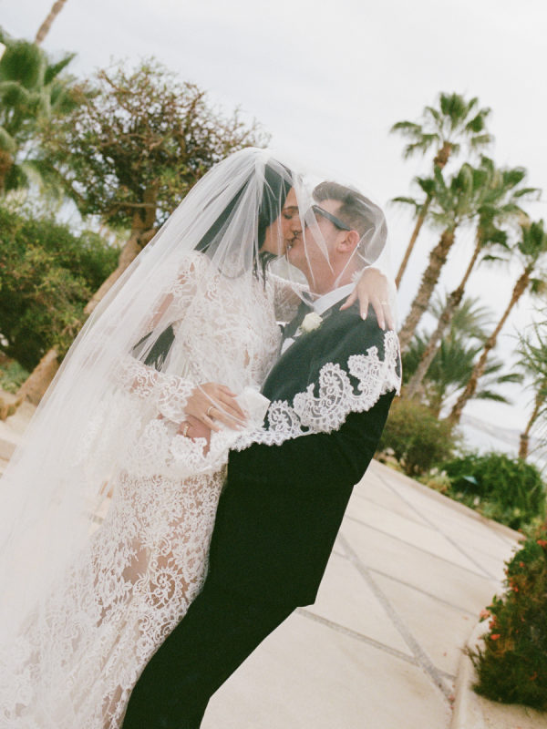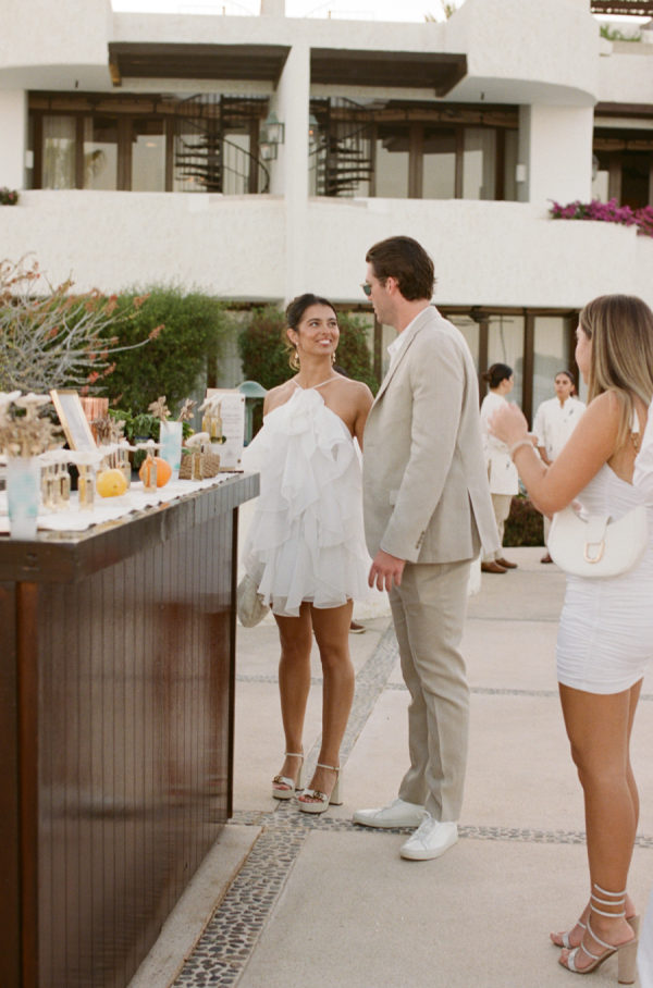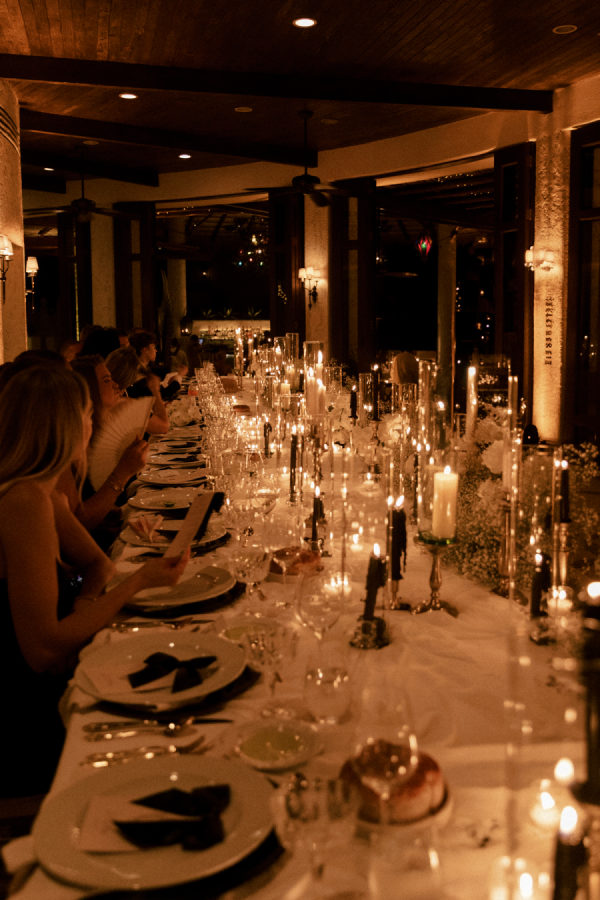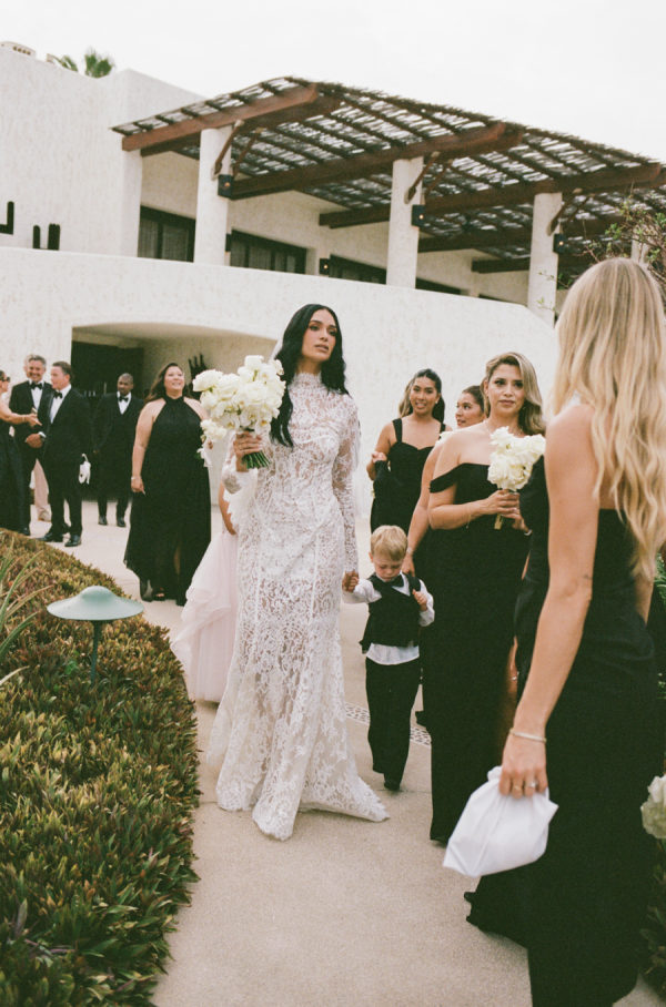 Robin and April love a clean, ethereal, and highly sophisticated aesthetic…so we presented a beautiful and bold event that reflected them as a couple and enhanced the beauty of the resort. Our bride’s love for black inspired a romantic contrast against the soft sand, creating a striking yin-yang harmony. Honeycomb Affair executed flawlessly the ethereal clouds of baby’s breath with delicate roses — one of her favorite flowers — to keep the look airy, clean, and intentional. The result: a bold yet dreamy setting where elegance meets edge, and softness dances with strength. We wanted to create with Honeycomb Affair and Cabo Linens things and more, gorgeous tables with endless depth of candles, flowy textiles, and our bride’s love for bows, topped off by our beautiful menu designed by Laura Elizabeth Patrick. Our day-of signage, created by Luxe and Linen, was crafted from beautiful marble, grounding the design with a sense of permanence and natural elegance. The stone’s timeless quality anchored the ethereal elements, creating a refined balance between softness and strength.
