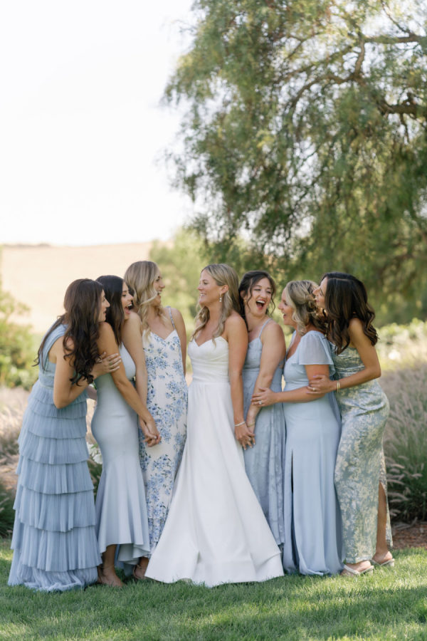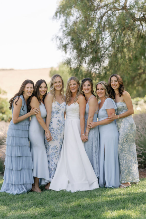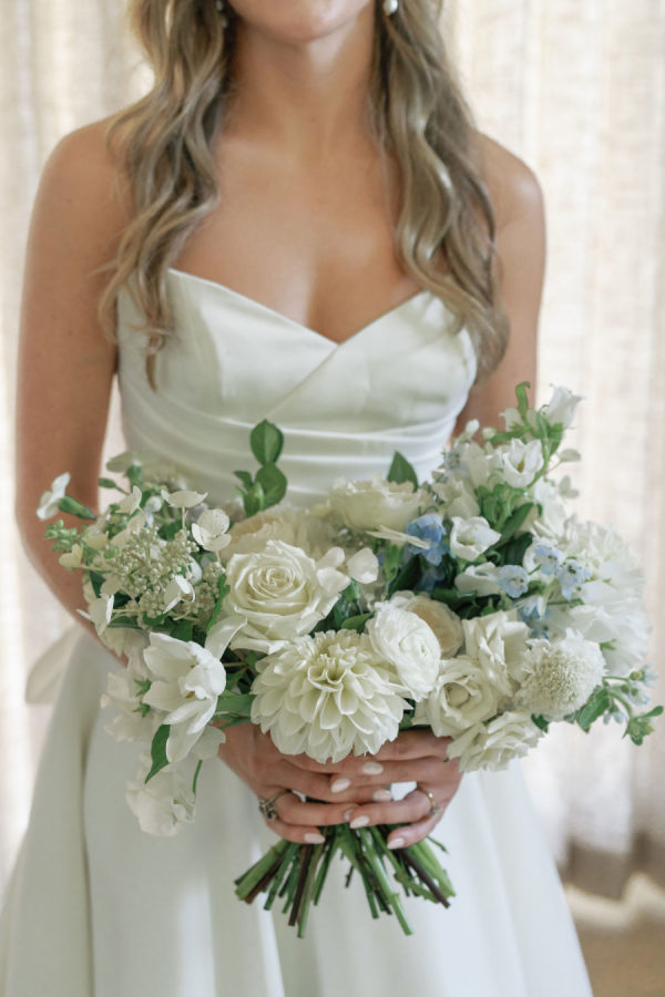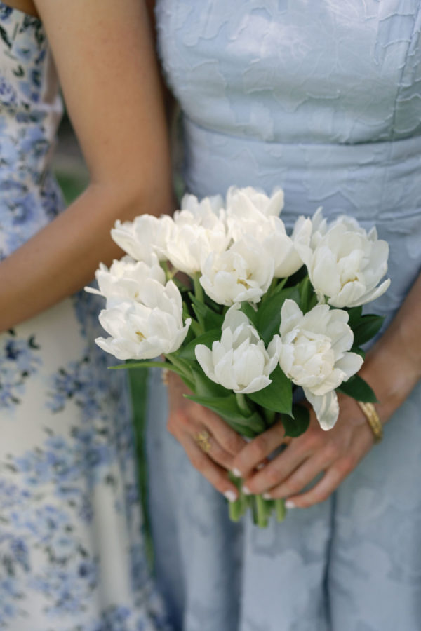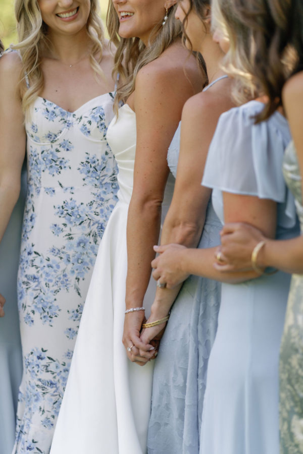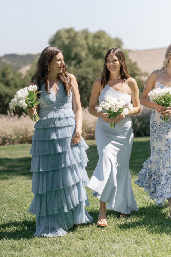 The bridesmaids’ dresses were varying shades of blue. Flouncy layers, blue summer florals, and soft textures made up the array of gowns. Their bouquets were simple and fresh with white blooms that matched the airy design of the day.