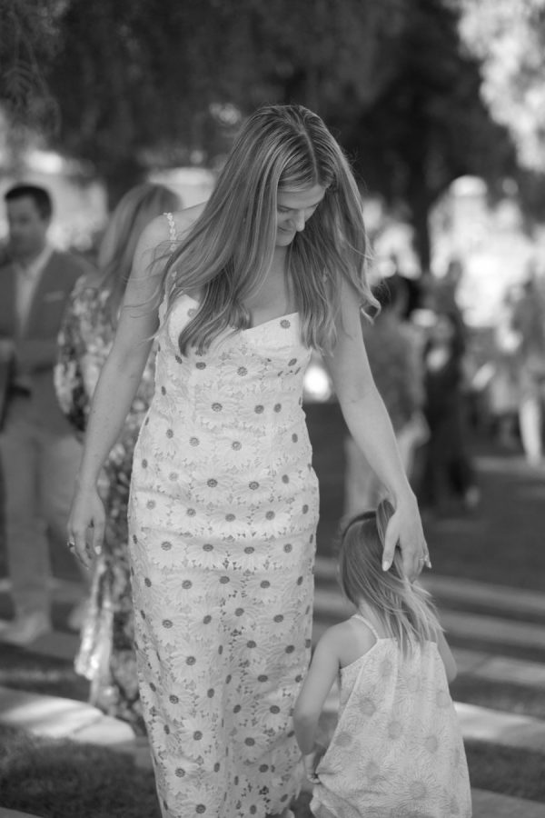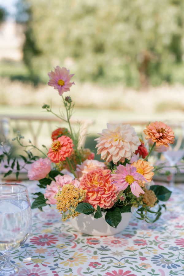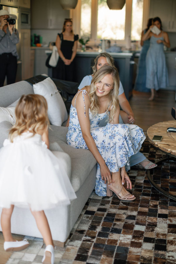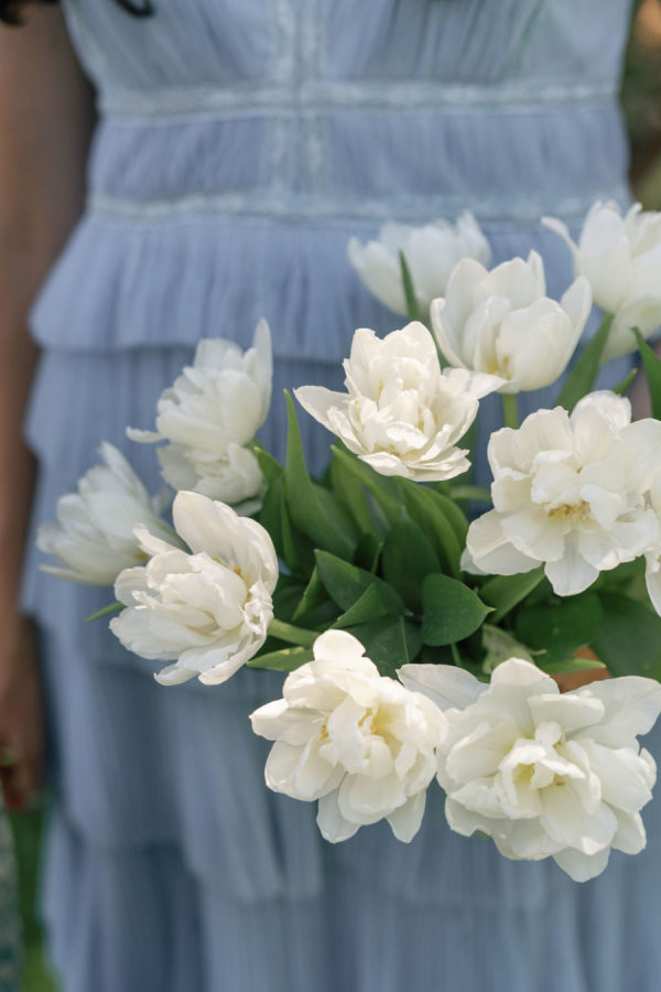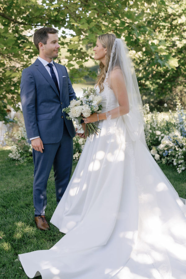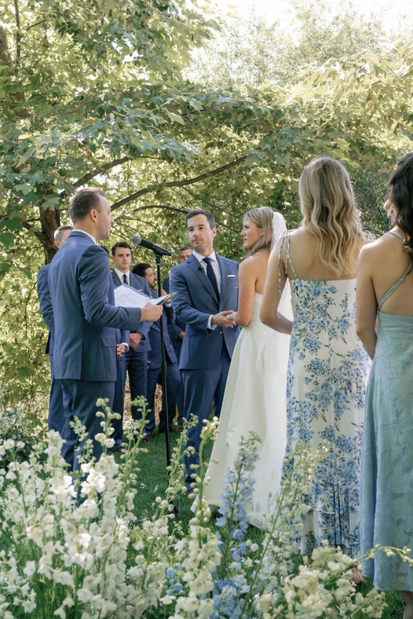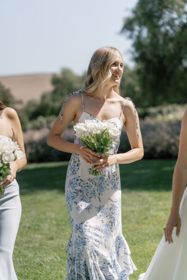 The bridesmaids’ dresses were varying shades of blue. Flouncy layers, blue summer florals, and soft textures made up the array of gowns. Their bouquets were simple and fresh with white blooms that matched the airy design of the day.