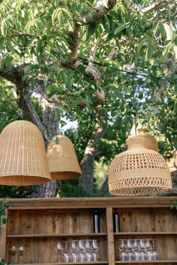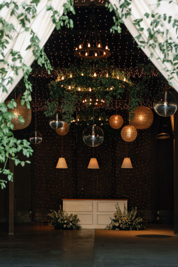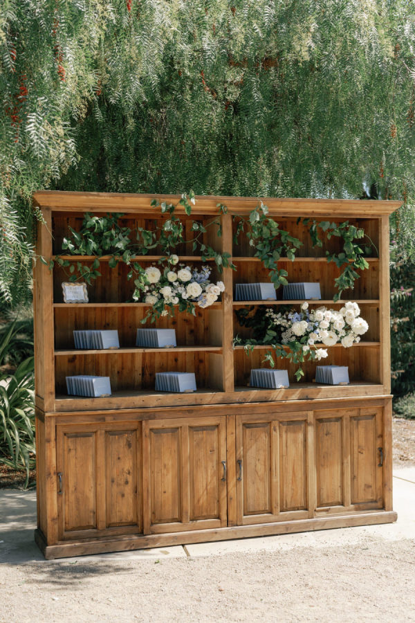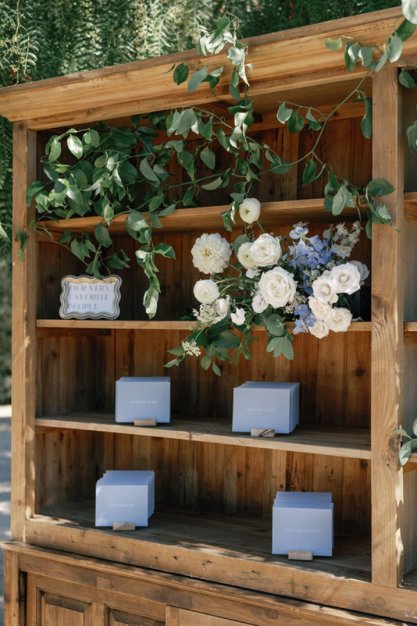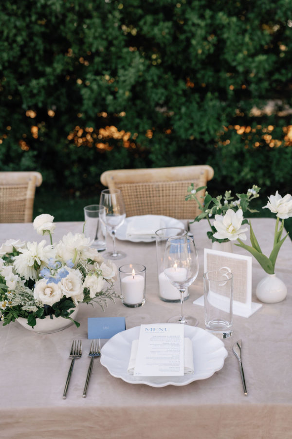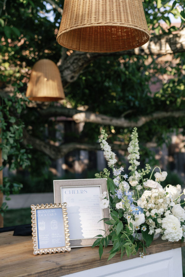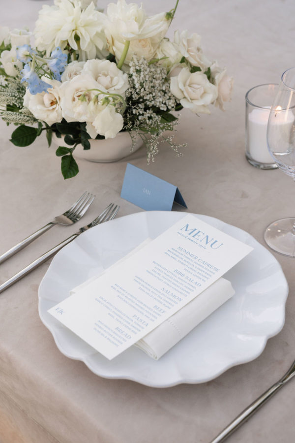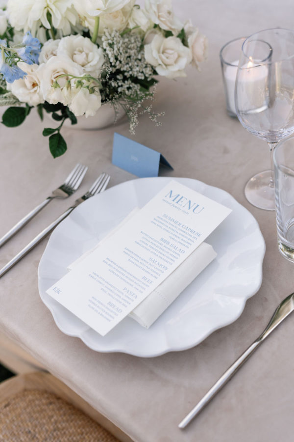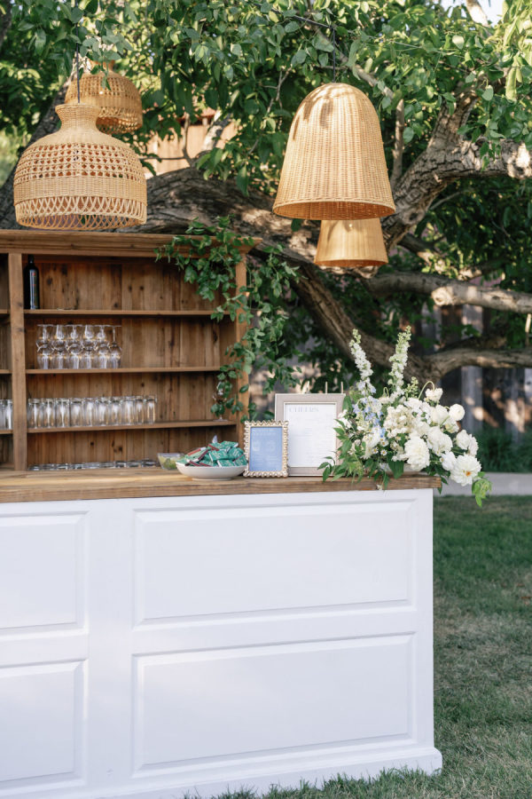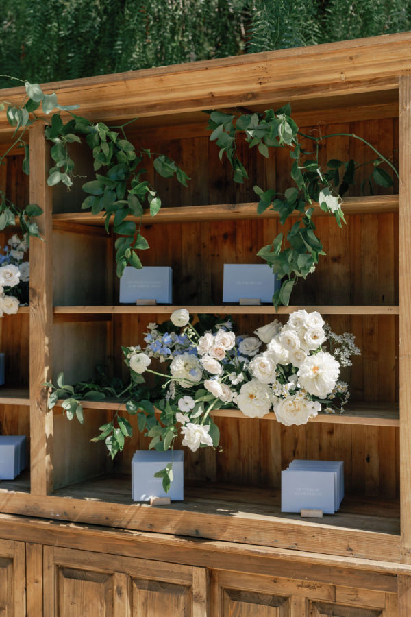 Summer whites and soft blues were the color tones for the florals that brought to life the coastal, vineyard ambiance. The rattan lanterns, wooden tones, and velvet linens added a warm touch to the breezy blues and whites of the florals. Inside the rustic barn of the vineyard, the large chandelier was intertwined with greenery, bringing the summery feel of outside into the barn as Emily and Kyle danced the night away.
