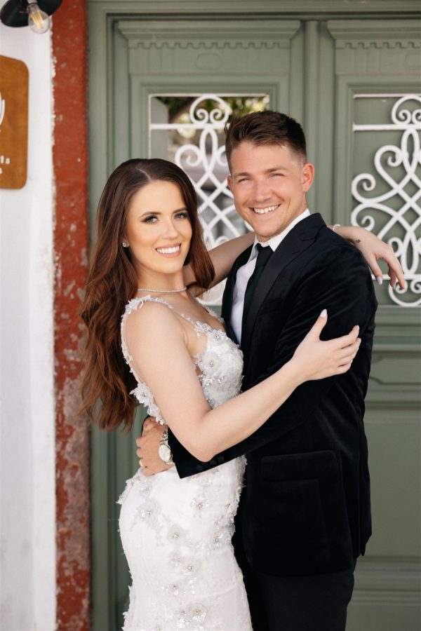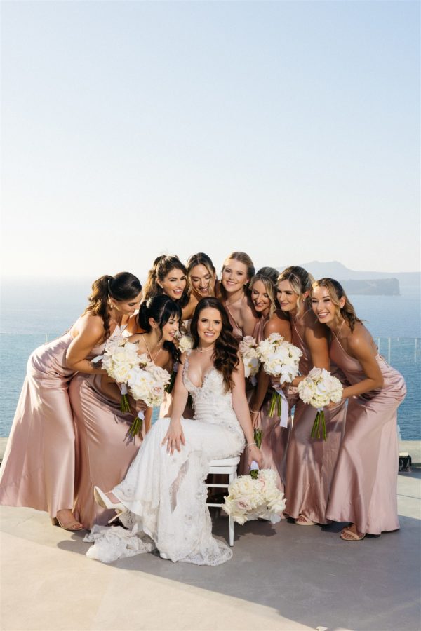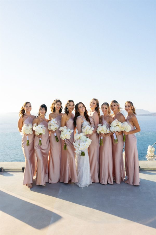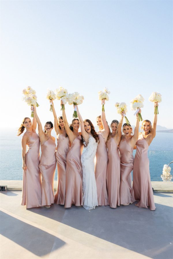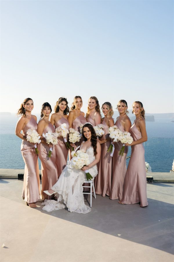 As the wedding planner, I had the honor of crafting an unforgettable experience for a couple whose love story deserved nothing less than a fairytale setting. Perched on the edge of the caldera, Cavo Ventus Villa offered a panoramic view of Santorini’s breathtaking volcanic landscape. Guests were greeted by an aisle lined with lush white blooms and soft pink roses, arranged in cascading perfection. The altar—a minimal yet impactful structure adorned with floral arrangements—seemed to float against the azure backdrop of the sea and sky.