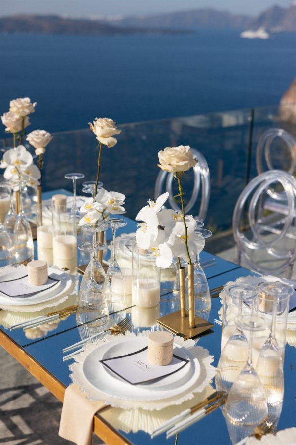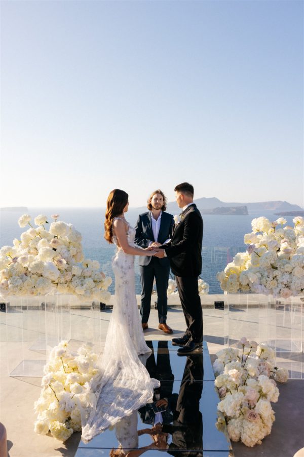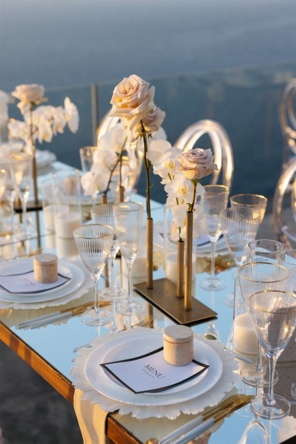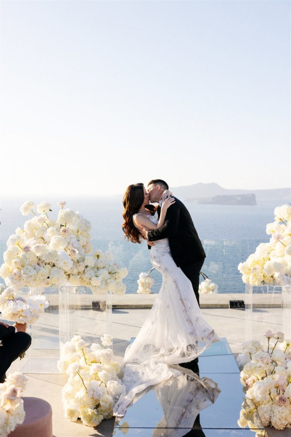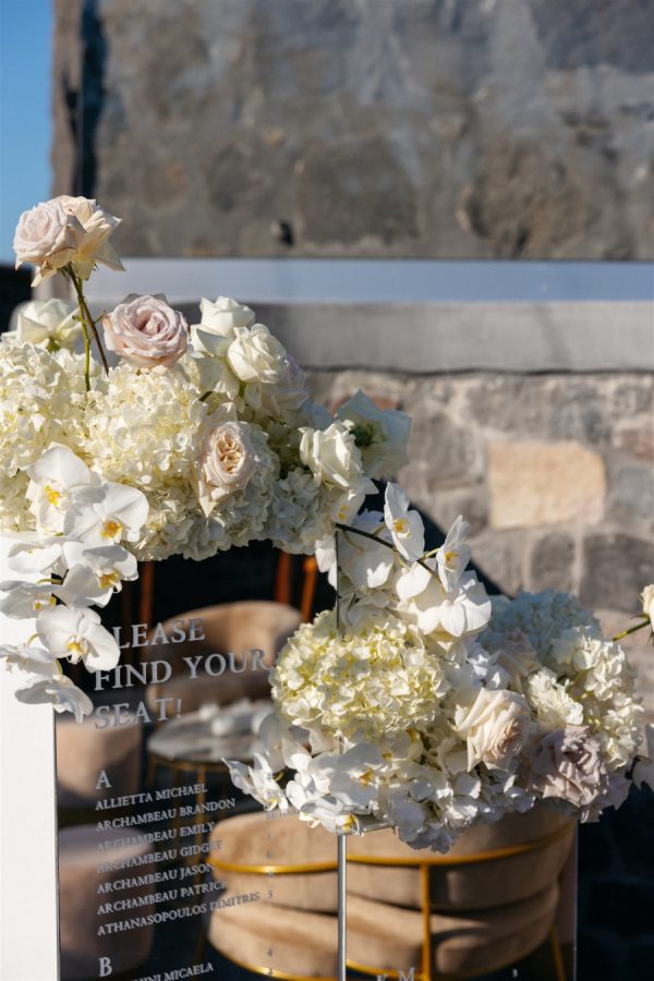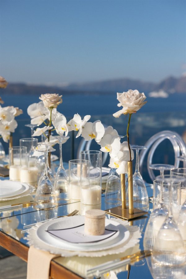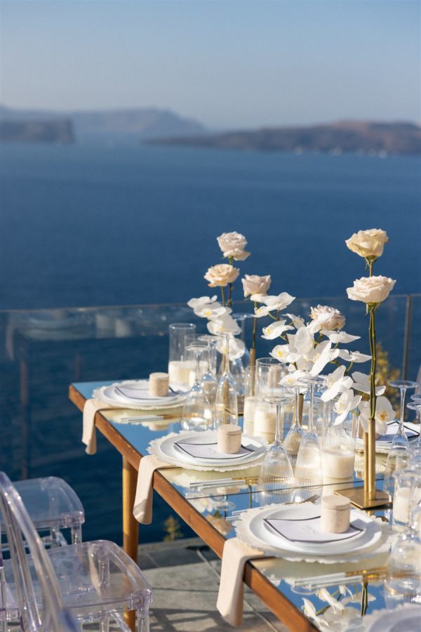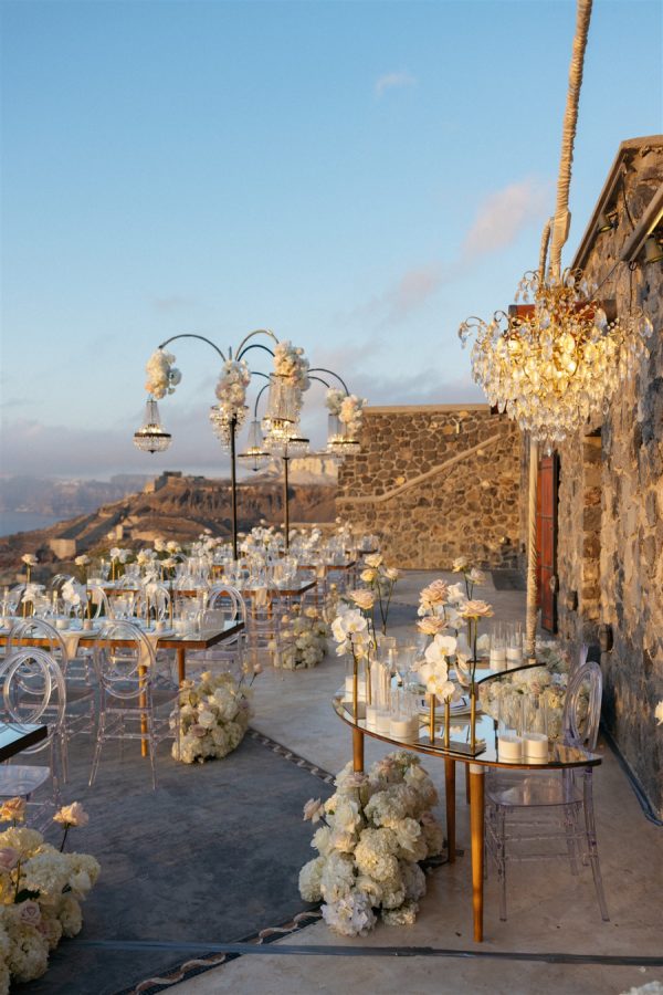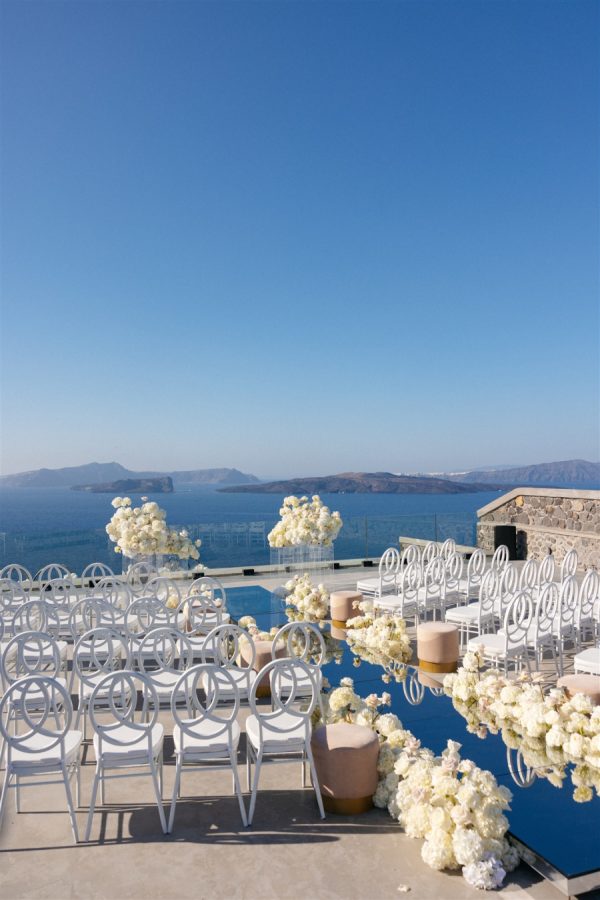 The floral design at this Cavo Ventus Villa wedding was a breathtaking celebration of elegance and romance. From the moment guests arrived, they were enveloped in a world of white and soft pink blooms, meticulously arranged to transform the venue into a floral wonderland. Every corner was infused with beauty, ensuring the couple’s vision of lavish luxury came to life.The ceremony design at Cavo Ventus Villa was a perfect blend of elegance and simplicity. Minimal transparent bases filled with lush white and soft pink blooms created a delicate yet impactful floral presence, allowing the natural beauty of Santorini to shine through. The aisle was lined with mirror panels, reflecting the stunning landscape and amplifying the beauty of the surrounding flowers.The dinner setup was the epitome of luxury, with sleek mirror tables reflecting the stunning caldera view, creating an ethereal atmosphere. Elegant flower stems in gold bases added a touch of refined beauty, while dozens of candles cast a soft, romantic glow throughout the space. Above, chandeliers adorned with flowers hung gracefully over the tables like umbrellas, elevating the intimate ambiance. The breathtaking views of the caldera provided the perfect backdrop, making the entire dining experience feel like a dream come true. Every detail exuded sophistication and understated elegance.