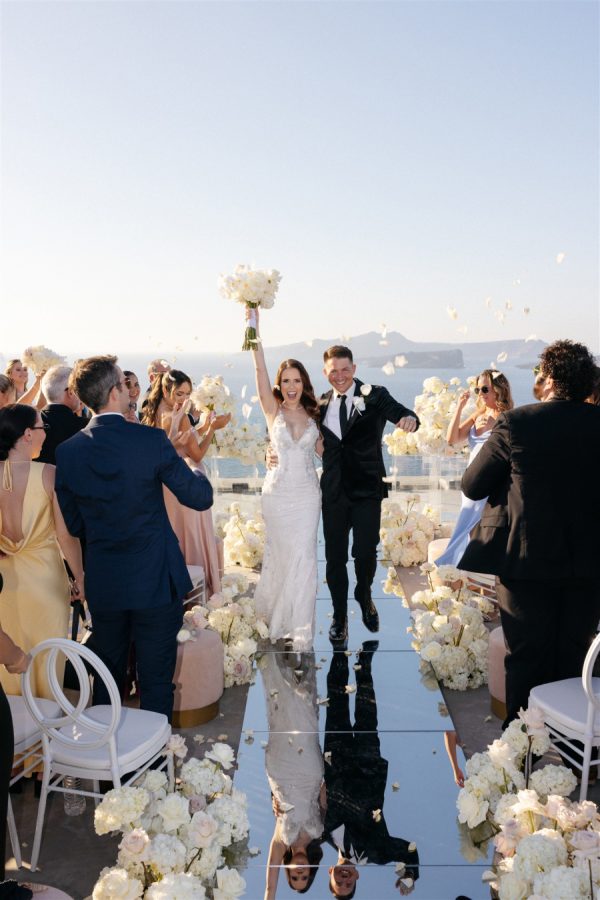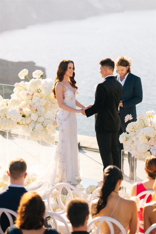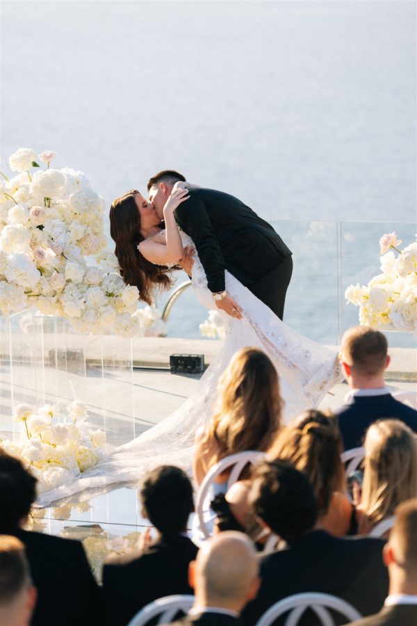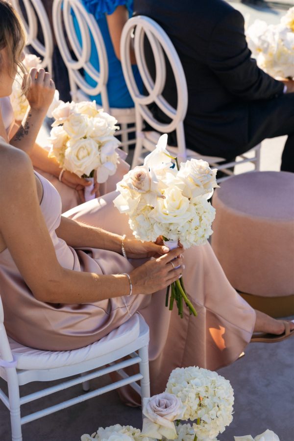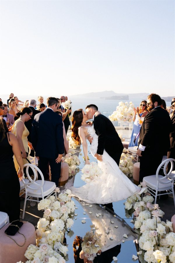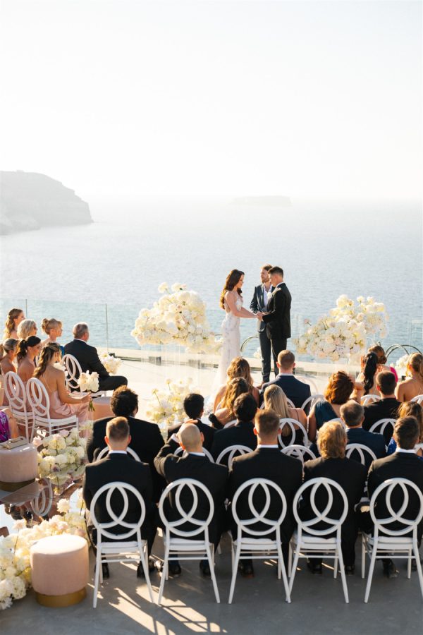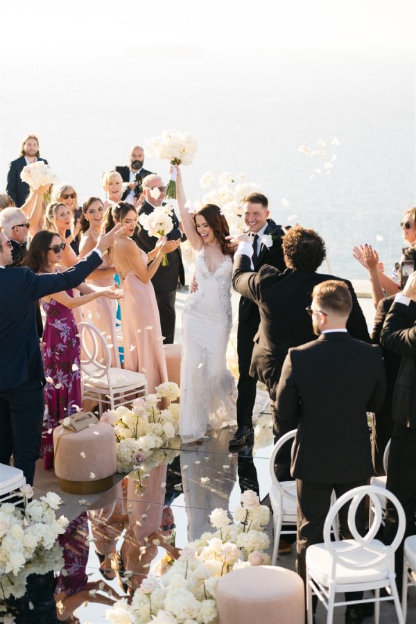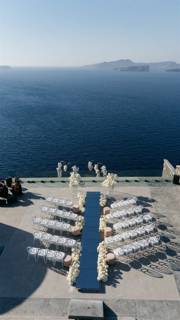 The floral design at this Cavo Ventus Villa wedding was a breathtaking celebration of elegance and romance. From the moment guests arrived, they were enveloped in a world of white and soft pink blooms, meticulously arranged to transform the venue into a floral wonderland. Every corner was infused with beauty, ensuring the couple’s vision of lavish luxury came to life.The ceremony design at Cavo Ventus Villa was a perfect blend of elegance and simplicity. Minimal transparent bases filled with lush white and soft pink blooms created a delicate yet impactful floral presence, allowing the natural beauty of Santorini to shine through. The aisle was lined with mirror panels, reflecting the stunning landscape and amplifying the beauty of the surrounding flowers.The dinner setup was the epitome of luxury, with sleek mirror tables reflecting the stunning caldera view, creating an ethereal atmosphere. Elegant flower stems in gold bases added a touch of refined beauty, while dozens of candles cast a soft, romantic glow throughout the space. Above, chandeliers adorned with flowers hung gracefully over the tables like umbrellas, elevating the intimate ambiance. The breathtaking views of the caldera provided the perfect backdrop, making the entire dining experience feel like a dream come true. Every detail exuded sophistication and understated elegance.