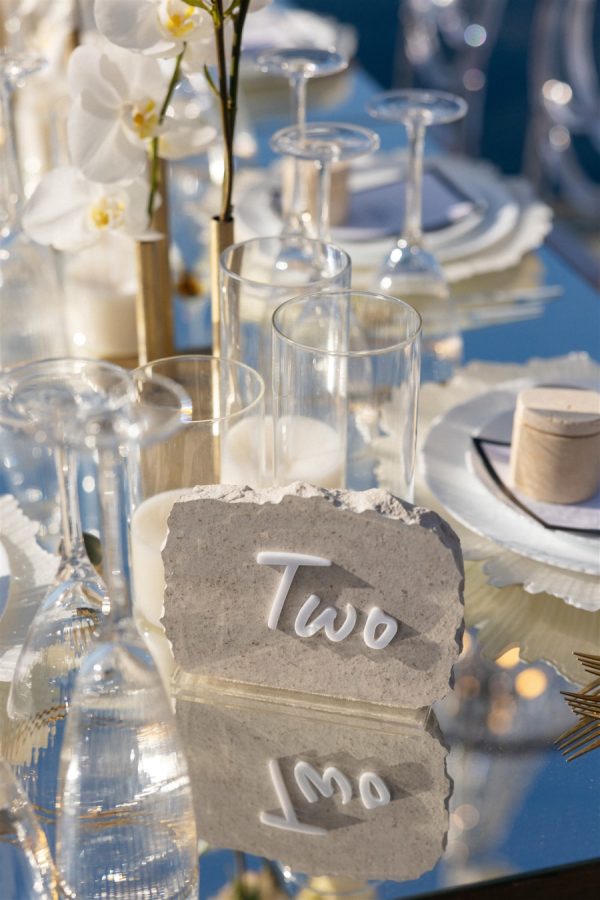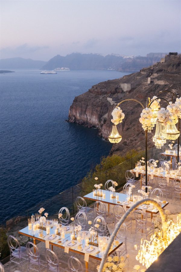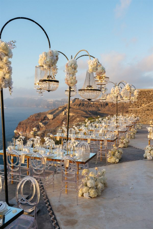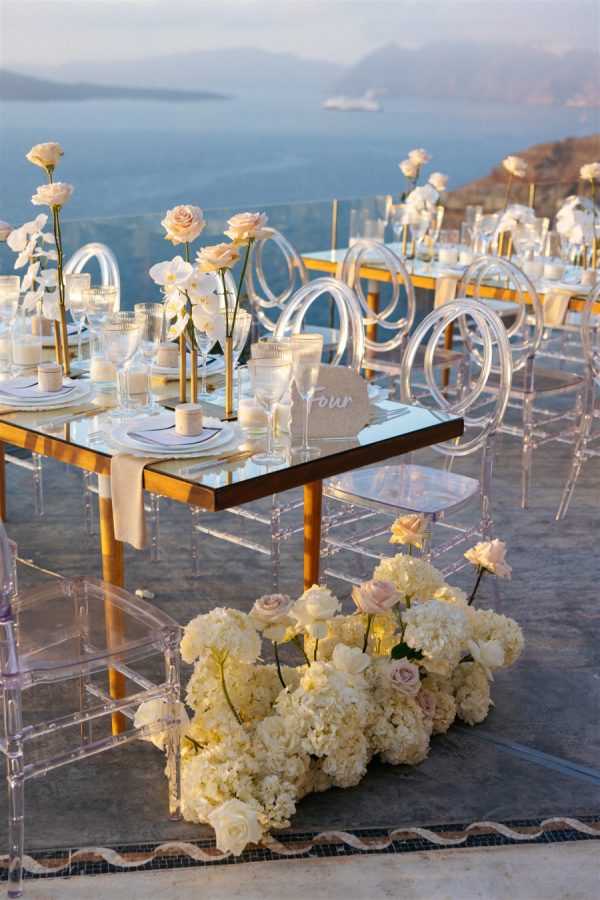 The reception space was a masterpiece of design, blending opulence with modern romance. Mirror-top tables, reflective of the Santorini sunset, were paired with transparent chairs for a touch of understated luxury and minimalism. Towering floral arrangements of white orchids, hydrangeas, and blush peonies adorned the tables, while chandeliers shaped like umbrellas hovered above, casting a soft, ambient glow.