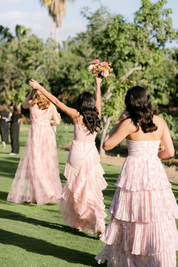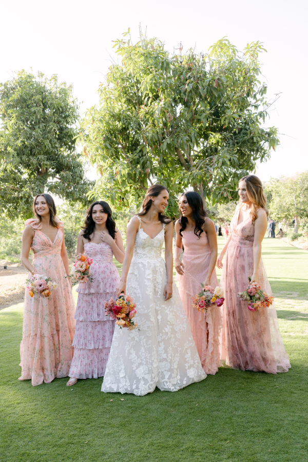 Bridesmaids selected their own dresses within a blush pink palette, allowing each to reflect their personal style while maintaining a soft, cohesive look that complemented the garden setting.