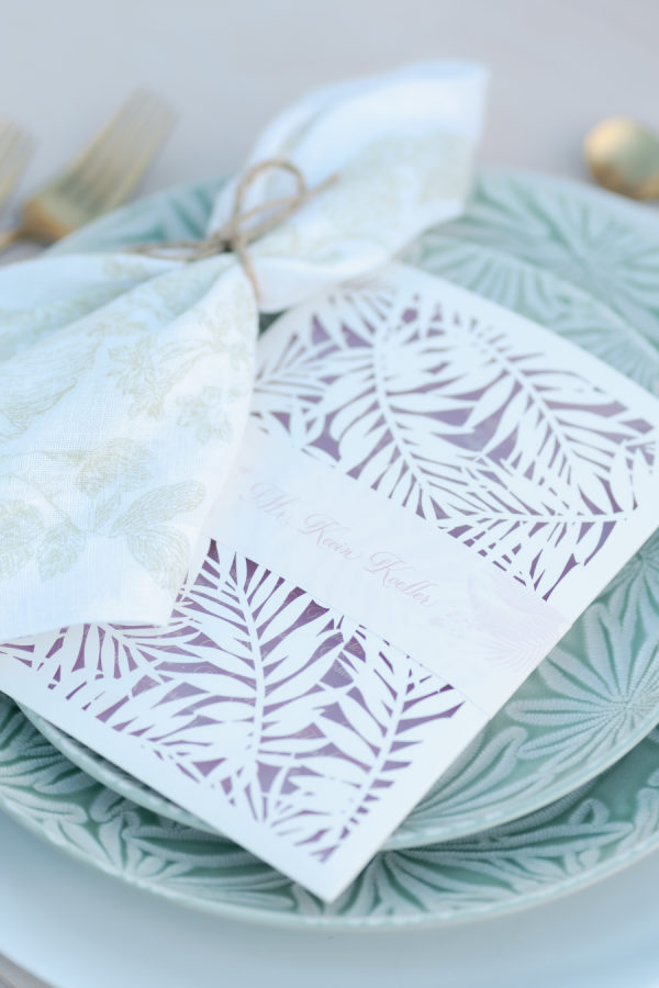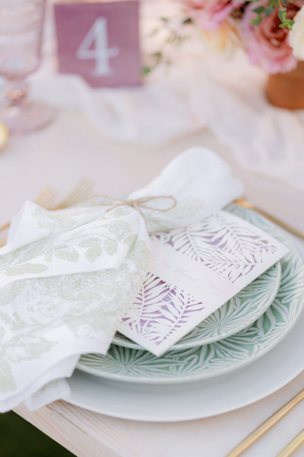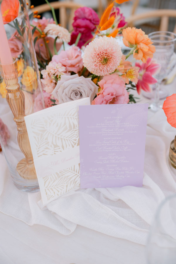 [field title=”Florals & Decor”]Florals took center stage in the overall design, weaving together blush, peach, coral, and lush greenery. The ceremony’s floral arch and aisle arrangements framed the vow exchange beautifully, while reception tables featured textured blooms, custom laser-cut menus, botanical-patterned plates, and soft linen napkins — every detail thoughtfully curated to feel organic, elegant, and personal.[/field]