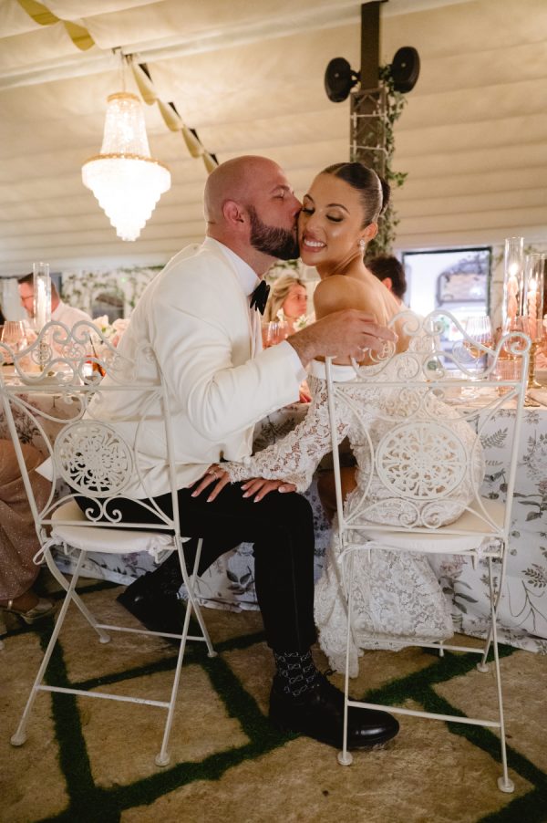 Reception decor was as airy as a modern fairytale. The couple brought in their own chandeliers and selected floral tablecloths to mirror the arrangements, creating a lush, cohesive design. Every pink-hued detail was perfectly coordinated, unfolding in a flurry of botanical beauty set against the spectacular backdrop of the Italian hillsides.