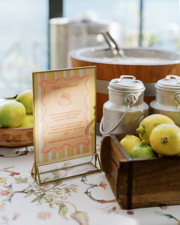 [field title=”Food & Drink”]As food lovers, we wanted the dining experience at our wedding to be a highlight, so we indulged in a luxurious three-hour tasting to select the perfect menu. We crafted a unique three-course meal that began with a burrata cheese soup, topped with semi-dried tomatoes and basil bread crumbles—an incredibly flavorful and creative antipasto. For the primo, we chose handmade maccheroncini pasta, tossed in a rich Parmesan sauce with summer truffle, while the secondo was a delicate seabass cooked in marine salt, accompanied by a refreshing orange and fennel salad. Our guests were blown away by the exquisite dishes, and while weddings usually offer multiple choices, we felt that everyone would be just as thrilled with the selections we had carefully curated—and they absolutely were![/field]