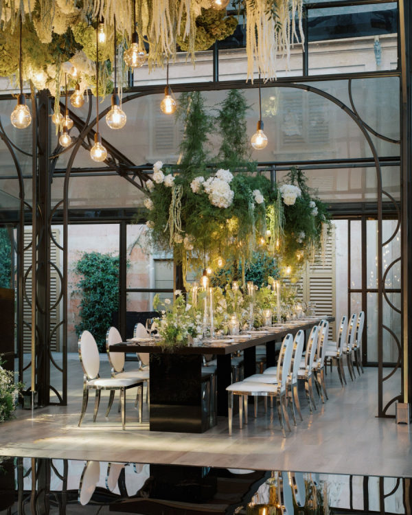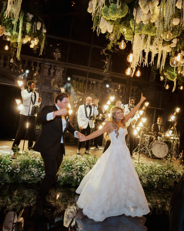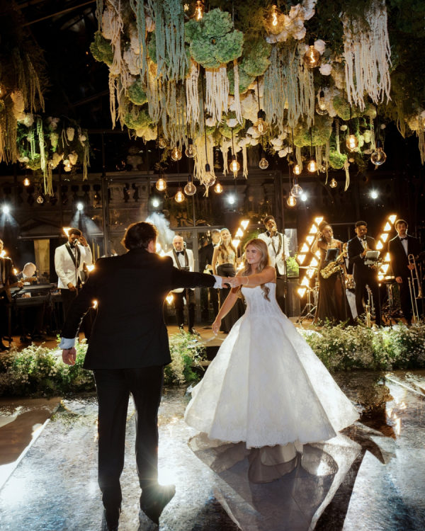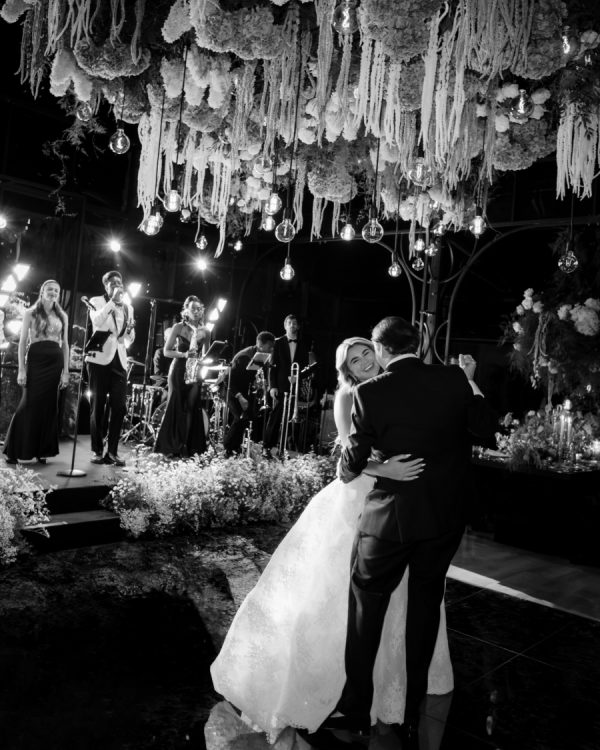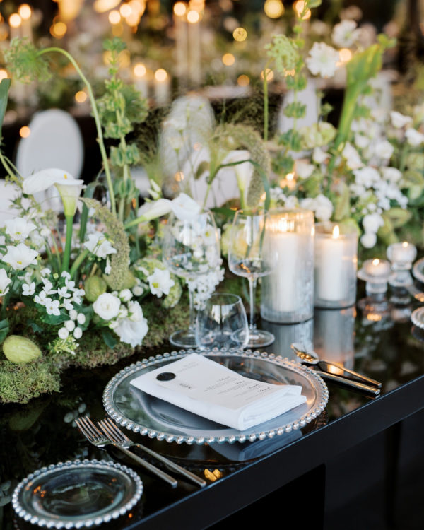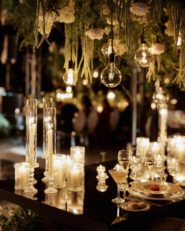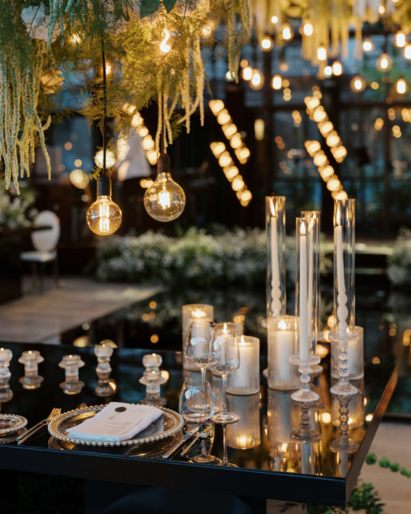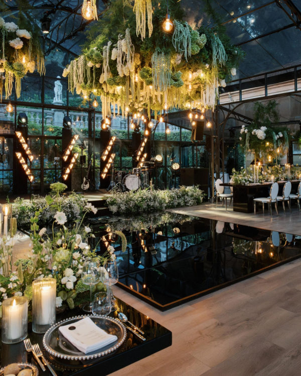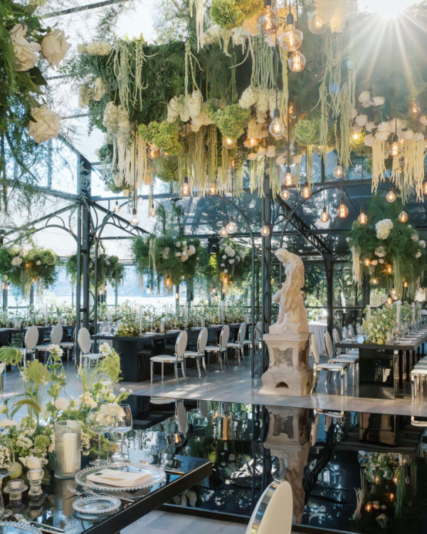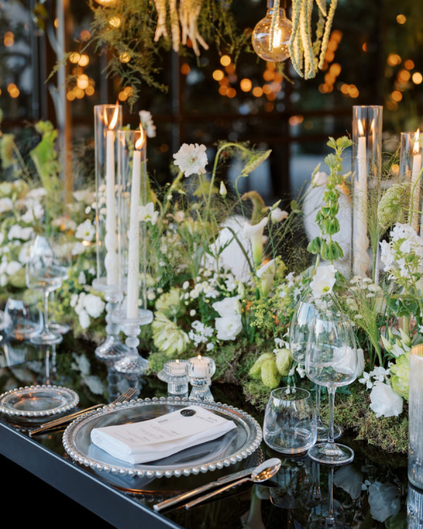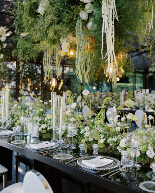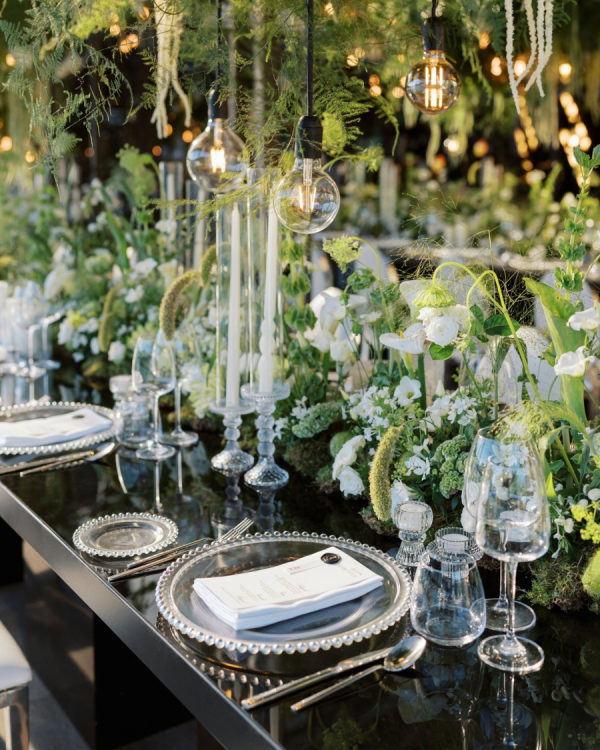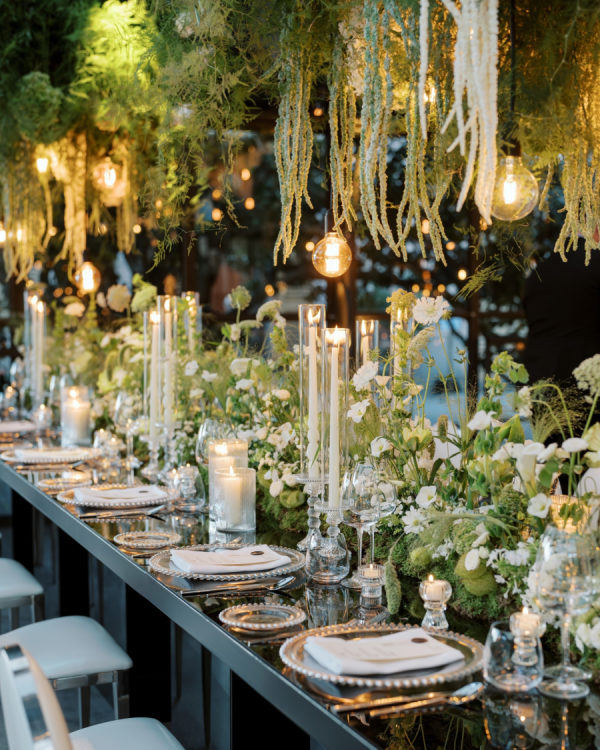 [field title=”Design / Vibe / Vision”]My vision for the wedding was to create something truly unique, timeless, and elegant, combining classic beauty with a modern twist. The space felt like an enchanted garden, with lush greenery and delicate white flowers suspended from above, creating a romantic, dreamlike atmosphere. This vision came to life through cascading floral arrangements, sleek black reflective tables, and warm candlelight that added an intimate and luxurious touch. The attention to detail, from the crystal glassware to the soft lighting, ensured that the ambiance perfectly embodied the sophisticated and elegant celebration we had always imagined.[/field]