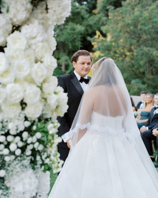 [field title=”Florals & Decor”]Our flowers and décor were designed to feel like a natural extension of the space, with an emphasis on elegance and class. For the ceremony, we added grass to the dock and created a stunning three-arch setup, with the outer arches draped in greenery and the middle arch fully covered in white flowers. At the cocktail hour, modern white furniture with green velvet pillows added a fresh, stylish touch, and I loved the unique shapes of the chairs and couches. The reception followed this theme, with floral chandeliers and table arrangements as the focal point, letting the flowers truly shine.[/field]