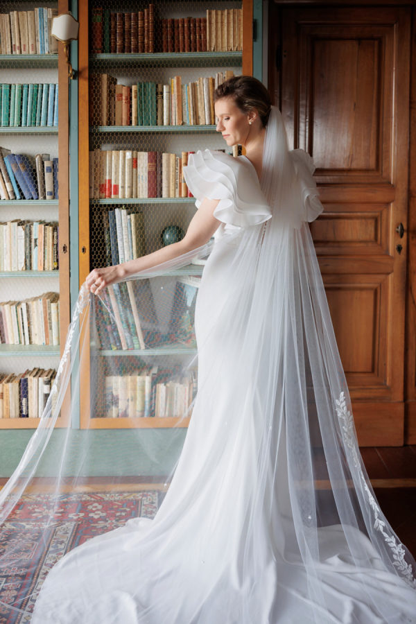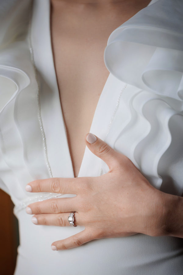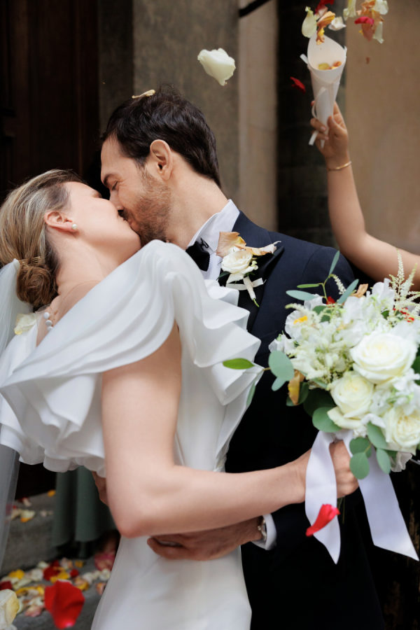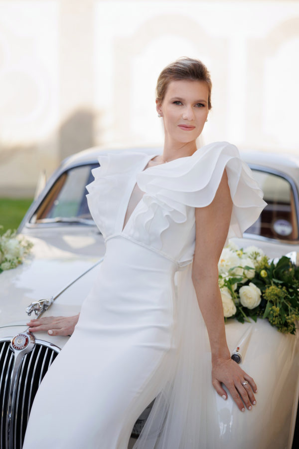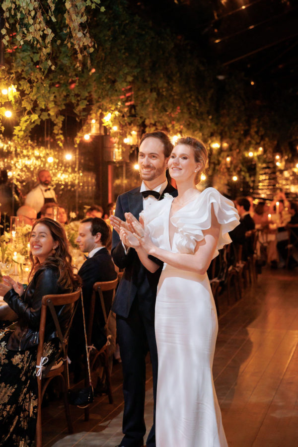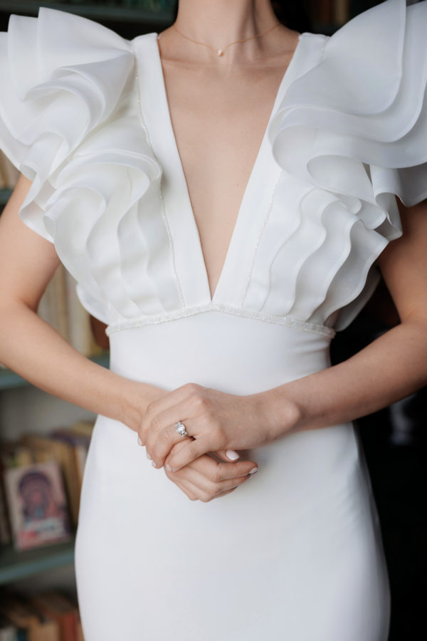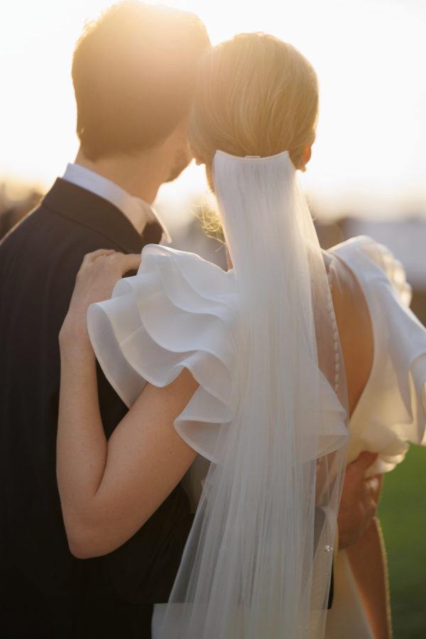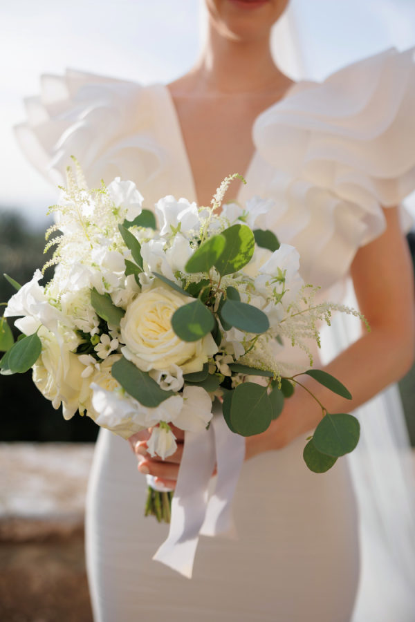 The bride wore a stunning Pronovias gown that perfectly embodied chic sophistication. Its refined silhouette was sleek and timeless, while dramatic ruffled shoulders added a bold, couture-inspired touch. Paired with understated accessories and an elegant updo, the gown struck a flawless balance between modern glamour and classic elegance, making it the centerpiece of her bridal style.