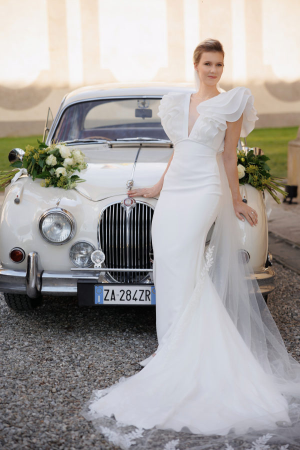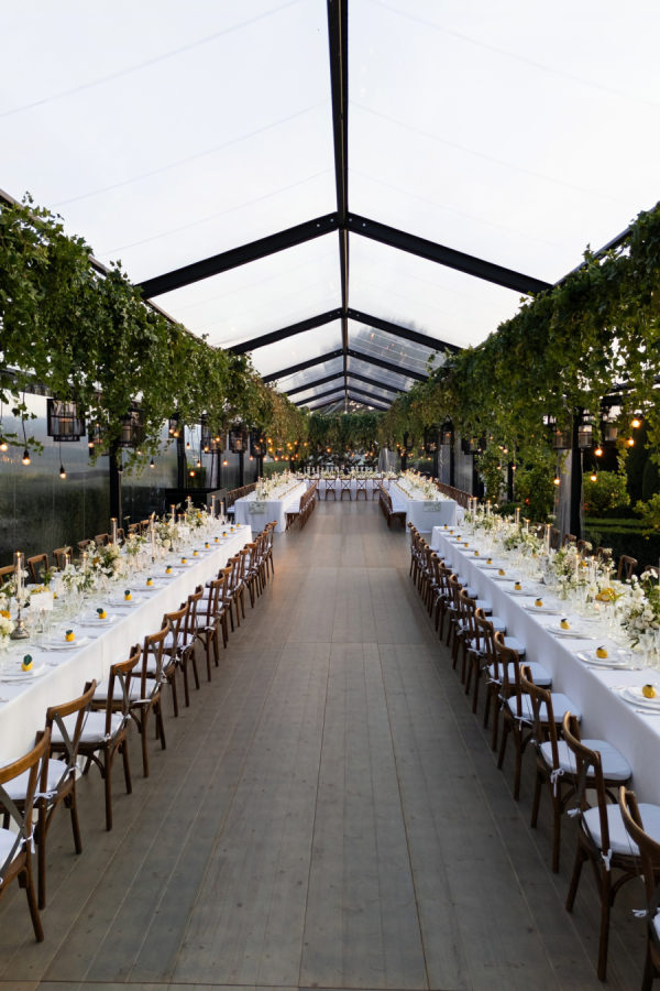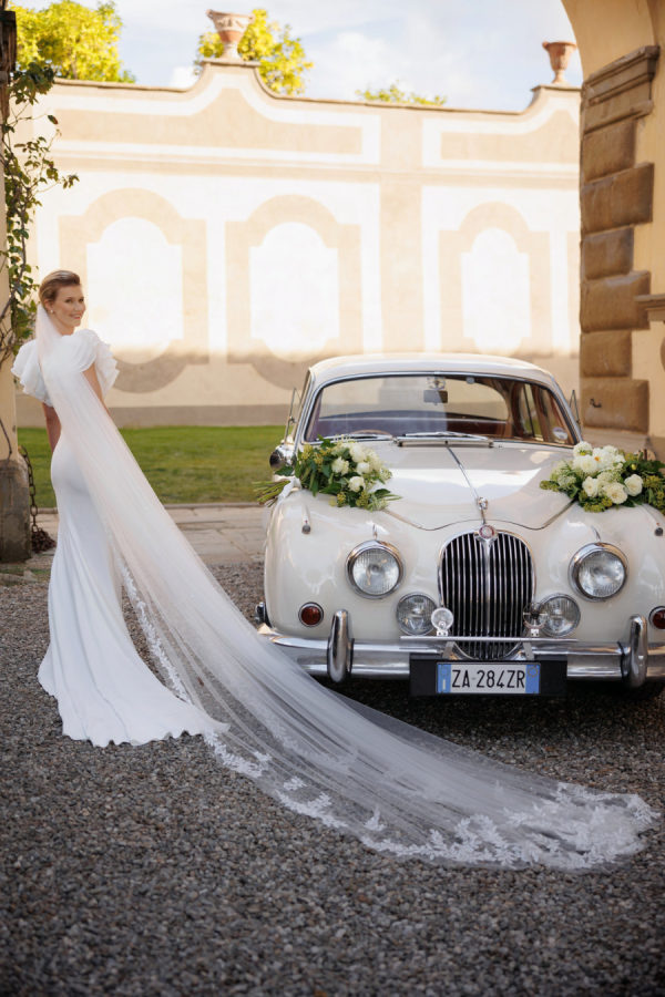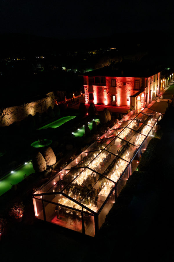 From the vintage white Jaguar adorned with florals, to the couture stationery suite with hand-painted invitations featuring watercolor illustrations of Villa Gamberaia, the chic Pronovias gown with its refined silhouette and dramatic ruffled shoulders, and the breathtaking lighting design — every element made this wedding a true showcase of timeless elegance and unforgettable moments. Thoughtful touches, such as vintage Kodak disposable cameras placed on the tables, allow guests to capture candid memories throughout the night, adding a playful and personal layer to the celebration. Every detail was carefully curated, creating an event rich in style, atmosphere, and cultural authenticity. Lighting played a central role in shaping the chic and luxurious ambiance. Inside the transparent marquee, cascading ivy was paired with suspended lanterns, string lights, and countless taper candles, casting a warm golden glow over the dinner tables. Outside, the Renaissance façade of Villa Gamberaia was dramatically illuminated while the gardens softly glowed, creating a truly magical backdrop. Later in the evening, the dance floor came alive with beams of light, delicate projections, and vibrant spotlights that amplified the energy of the live band, transforming the celebration into a cinematic and immersive experience from the elegant dinner to the unforgettable party.