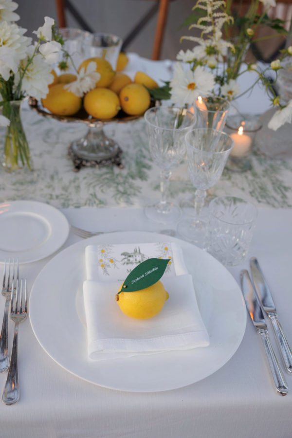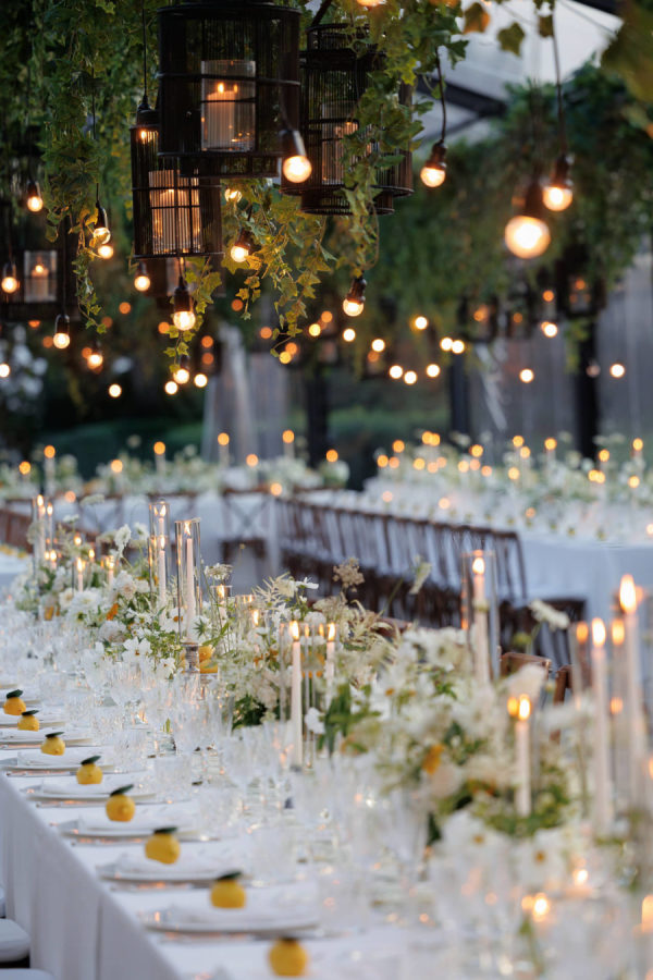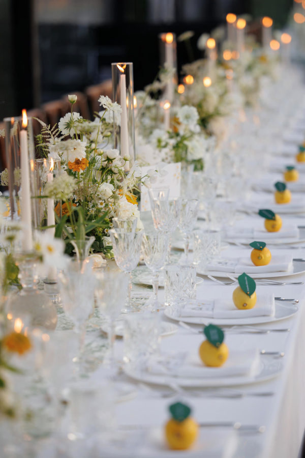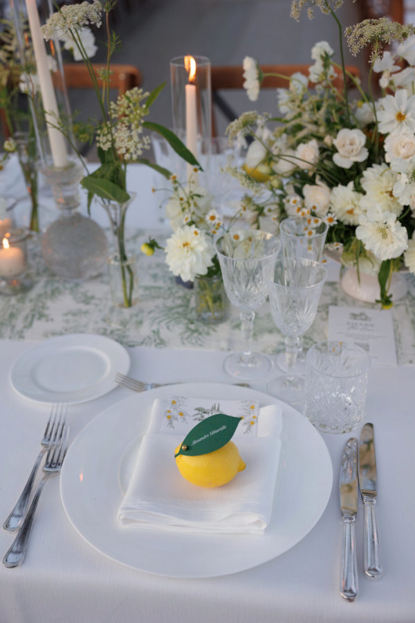 [field title=”Florals & Decor”]The design combined timeless elegance with a fresh Mediterranean touch. The color palette — white, light yellow, yellow, light green, and dark green — set the tone for a refined yet joyful celebration. Floral arrangements featured white dahlias, garden roses, cosmos, and delicate Queen Anne’s lace, accented by vibrant orange zinnias. Long tables were styled with refined white compositions and tall taper candles, while lush cascades of ivy created a romantic canopy overhead. Fresh lemons added a cheerful pop of color and tied in beautifully with the stationery and the overall atmosphere of Villa Gamberaia.