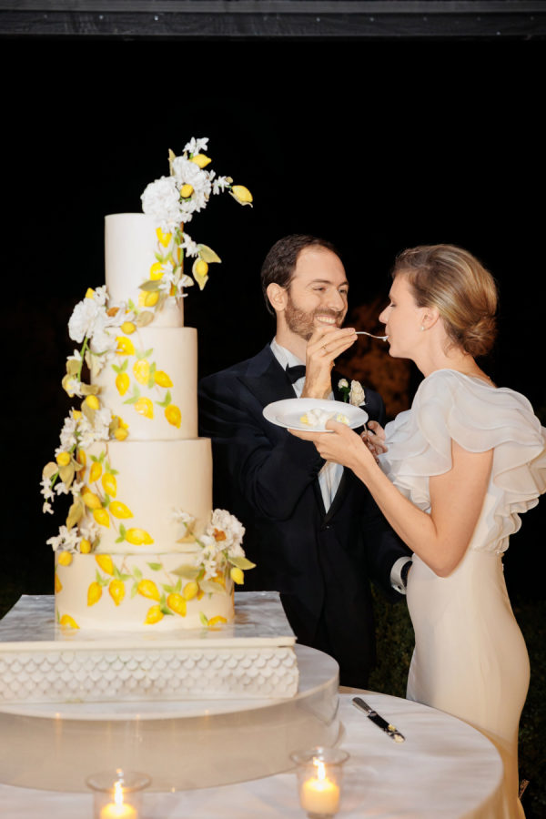 The wedding cake was a true showstopper: a towering four-tier creation adorned with hand-painted lemons and delicate sugar flowers. Its design perfectly echoed the wedding’s color palette of white, yellow, and green, and beautifully tied in with the Mediterranean details seen throughout the day. Displayed under the stars with candlelight and a backdrop of lemon trees, the cake cutting became a glamorous highlight of the evening — both elegant and joyful.