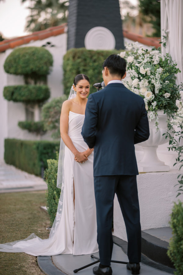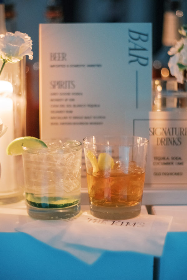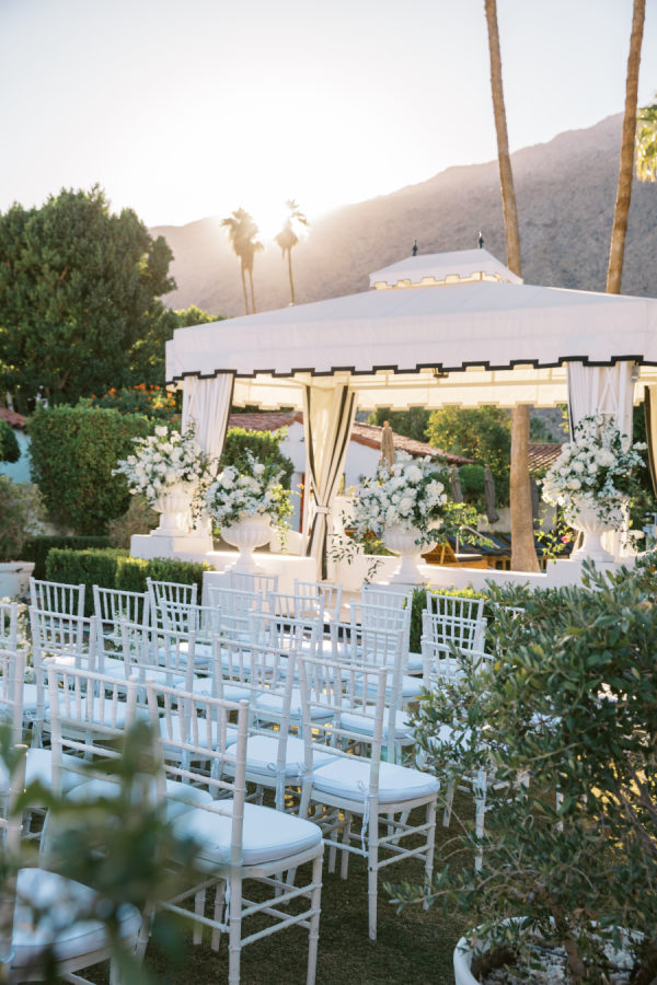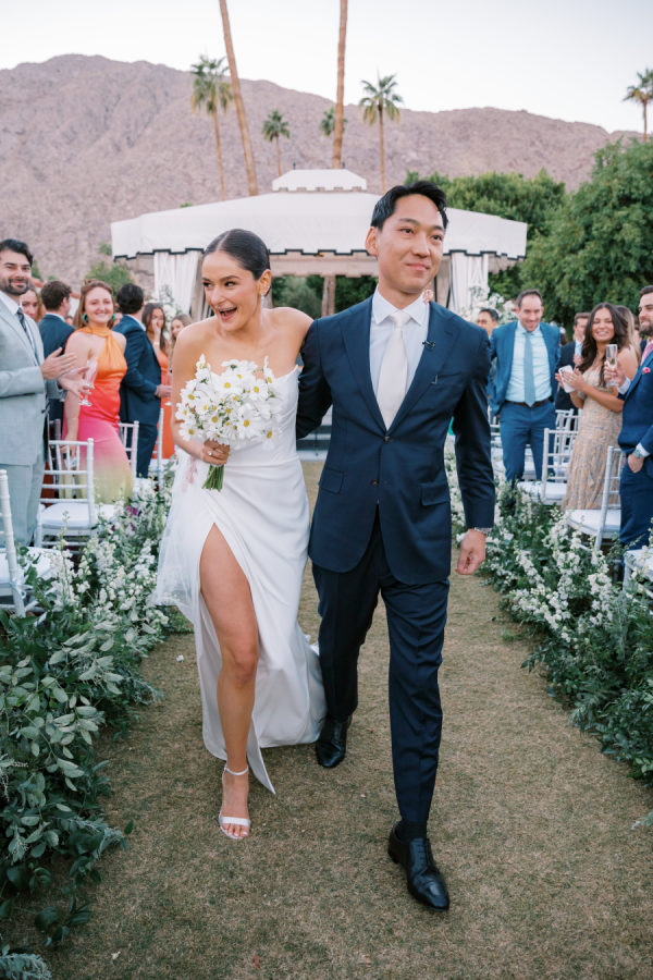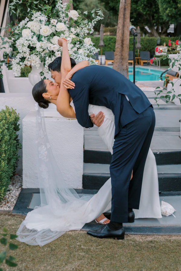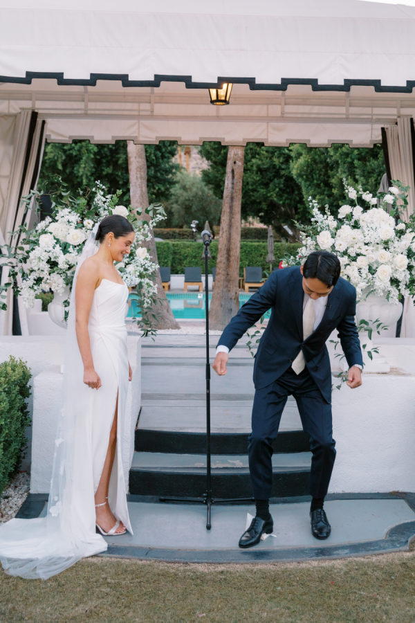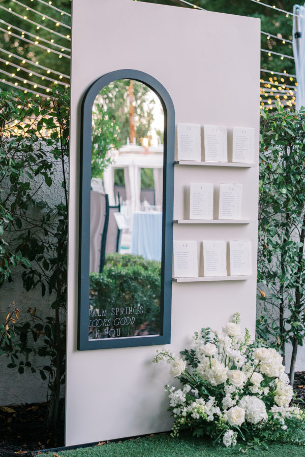 The ceremony had an ombre aisle, starting with greenery, and then white florals were added, gradually increasing in quantity as you got closer to the ceremony front. Bridesmaids had individual ingredient bouquets to complement their beautiful mismatched bridesmaid dresses. The Kims were married on 11/11, so it just seemed fitting that KIMS has an 11/11 in it. Take a peek at their cocktail napkins + afterparty slippers to see what we mean. Guests were welcomed into the cocktail hour with a “Palm Springs looks good on you” mirrored seating chart display, where guests would find their table and could take a selfie. The draped entryway led guests into a twinkle light monocratic white on white reception, with single ingredient floral arrangements + candles dressing the tables. After dinner, guests were surprised with an epic after party in the ballroom, decorated with balloons filling the ceiling and silver fringe chandeliers, setting the tone for an epic dance party. Branded slippers awaited guests so they could dance the night away in comfort.