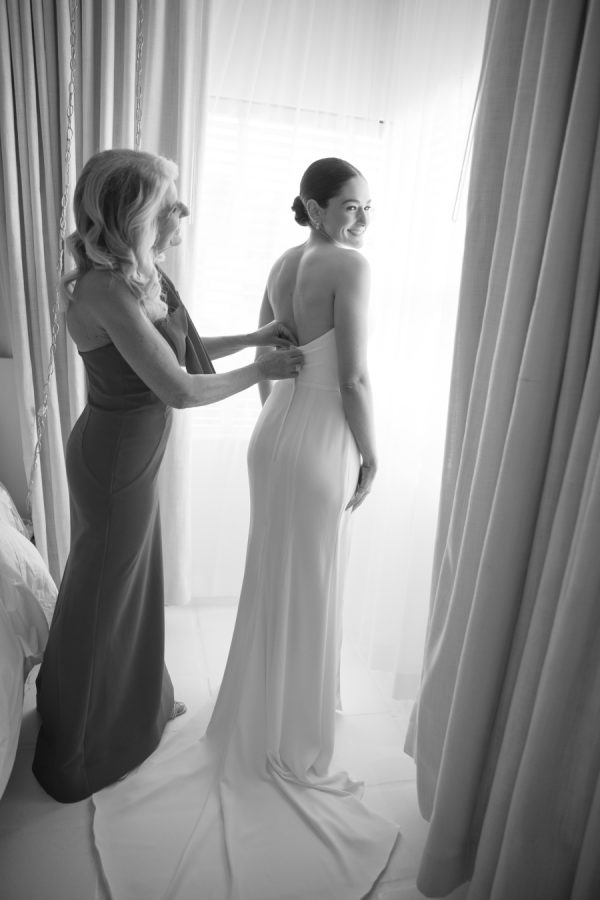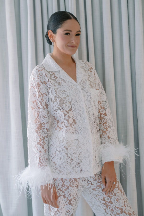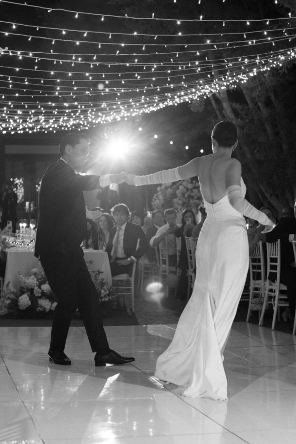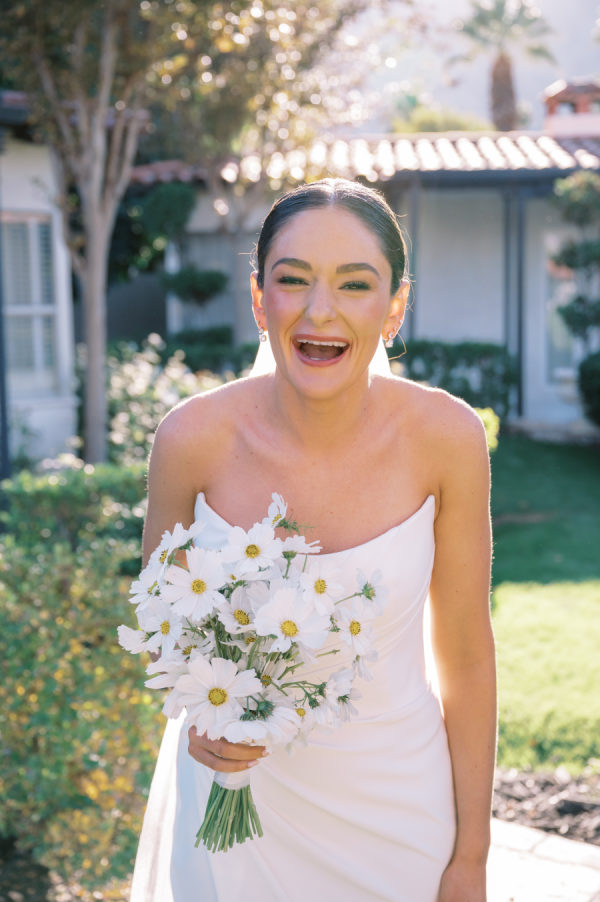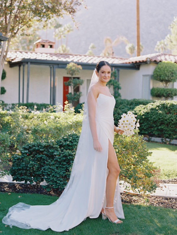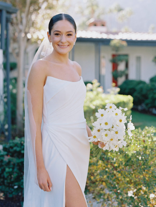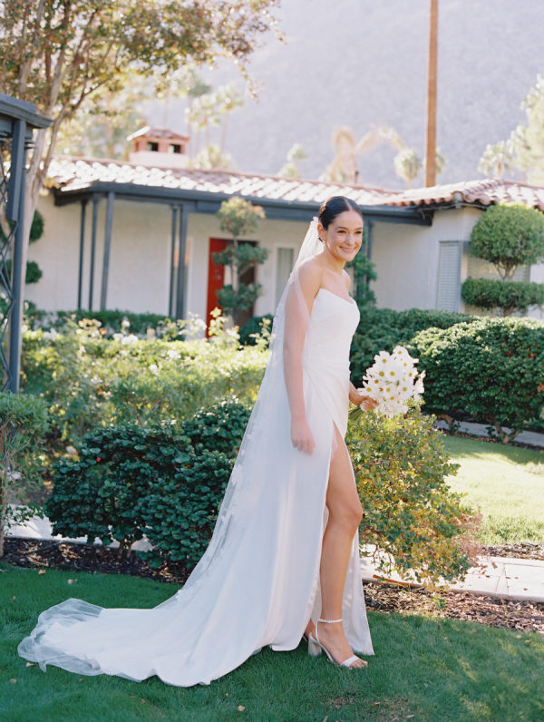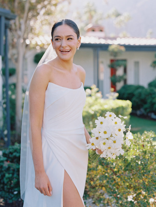 The ceremony had an ombre aisle, starting with greenery, and then white florals were added, gradually increasing in quantity as you got closer to the ceremony front. Bridesmaids had individual ingredient bouquets to complement their beautiful mismatched bridesmaid dresses. The Kims were married on 11/11, so it just seemed fitting that KIMS has an 11/11 in it. Take a peek at their cocktail napkins + afterparty slippers to see what we mean. Guests were welcomed into the cocktail hour with a “Palm Springs looks good on you” mirrored seating chart display, where guests would find their table and could take a selfie. The draped entryway led guests into a twinkle light monocratic white on white reception, with single ingredient floral arrangements + candles dressing the tables. After dinner, guests were surprised with an epic after party in the ballroom, decorated with balloons filling the ceiling and silver fringe chandeliers, setting the tone for an epic dance party. Branded slippers awaited guests so they could dance the night away in comfort.
