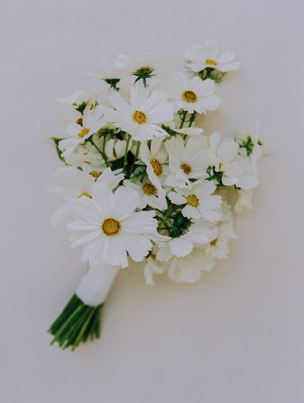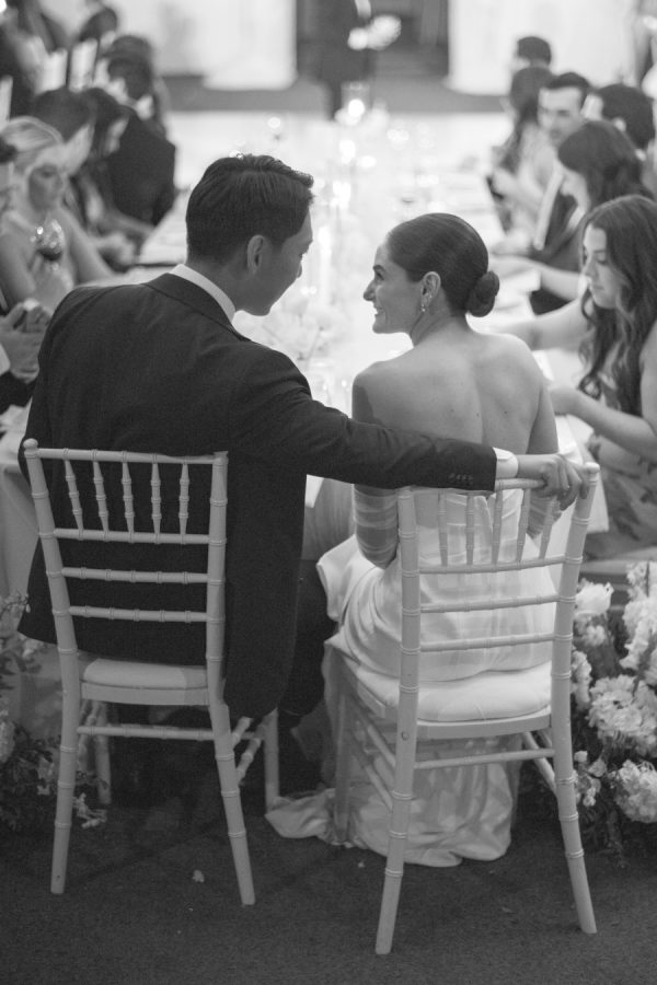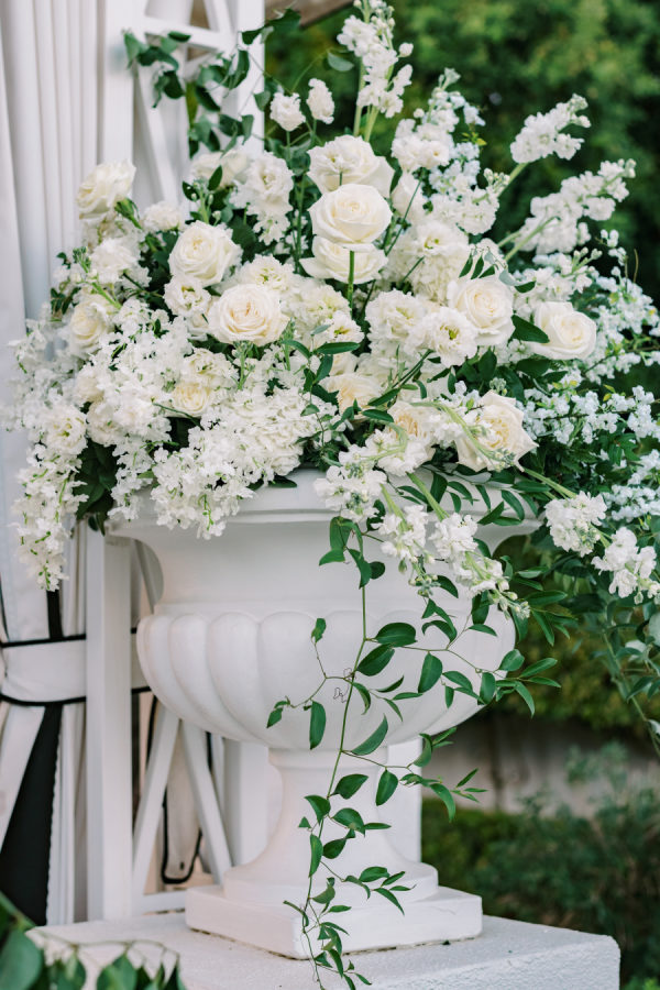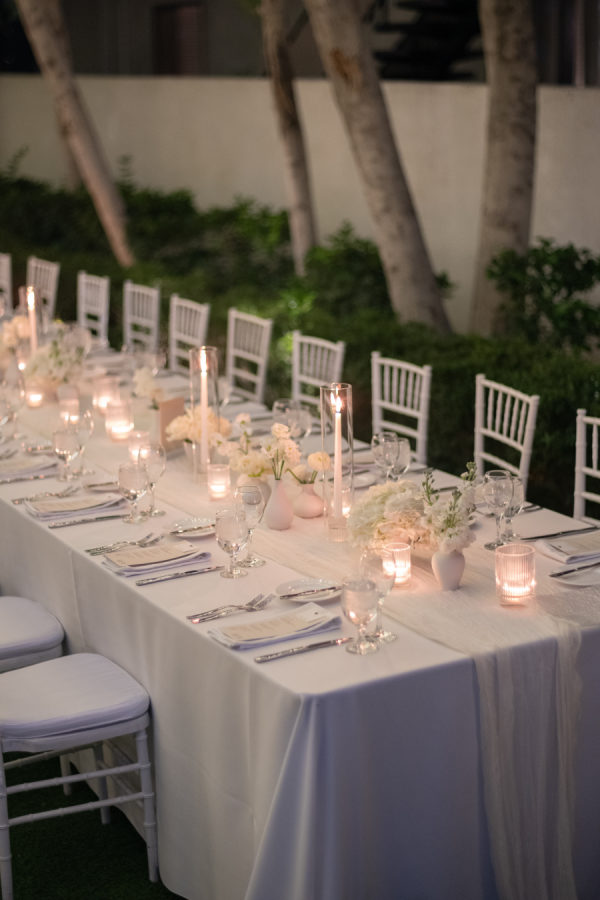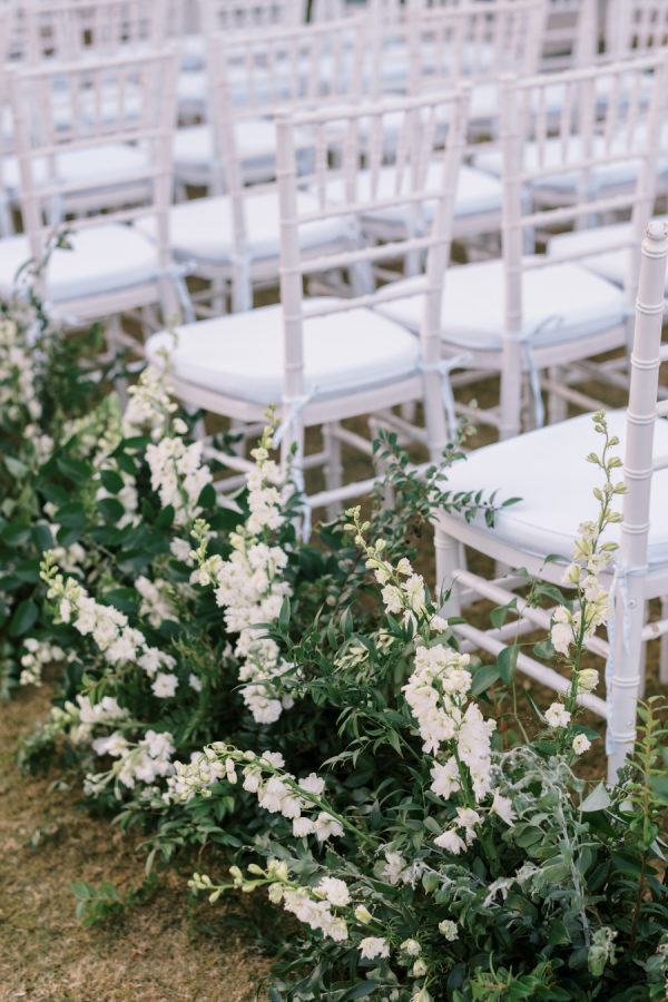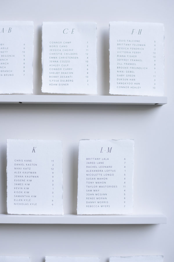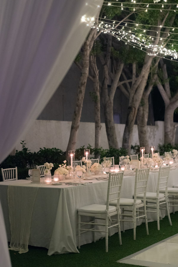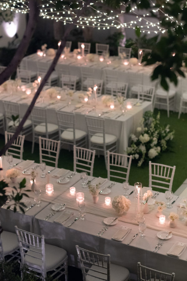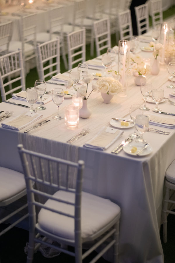 The wedding design was airy yet modern, whimsical, traditional, and romantic. There were classic elements with a modern flair and lots of texture. Texture was brought into the design with lots of different florals in shades of white, handmade paper signage, an airy table runner, and lots of twinkle lights.
