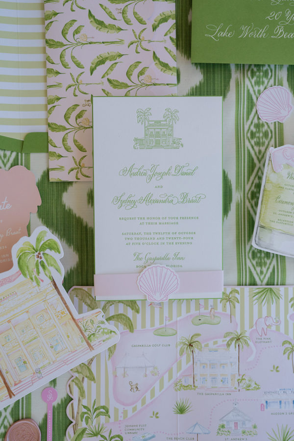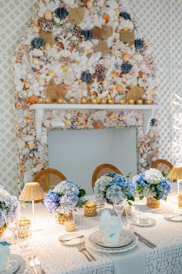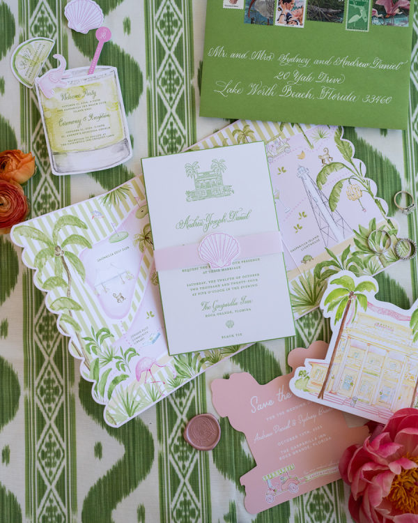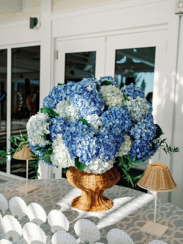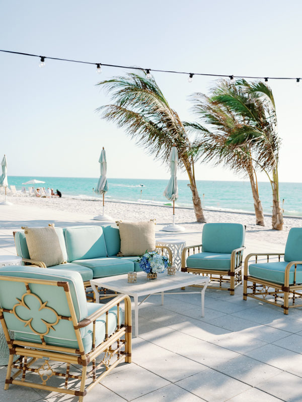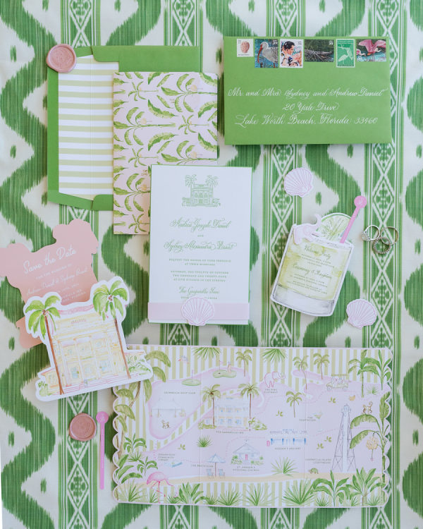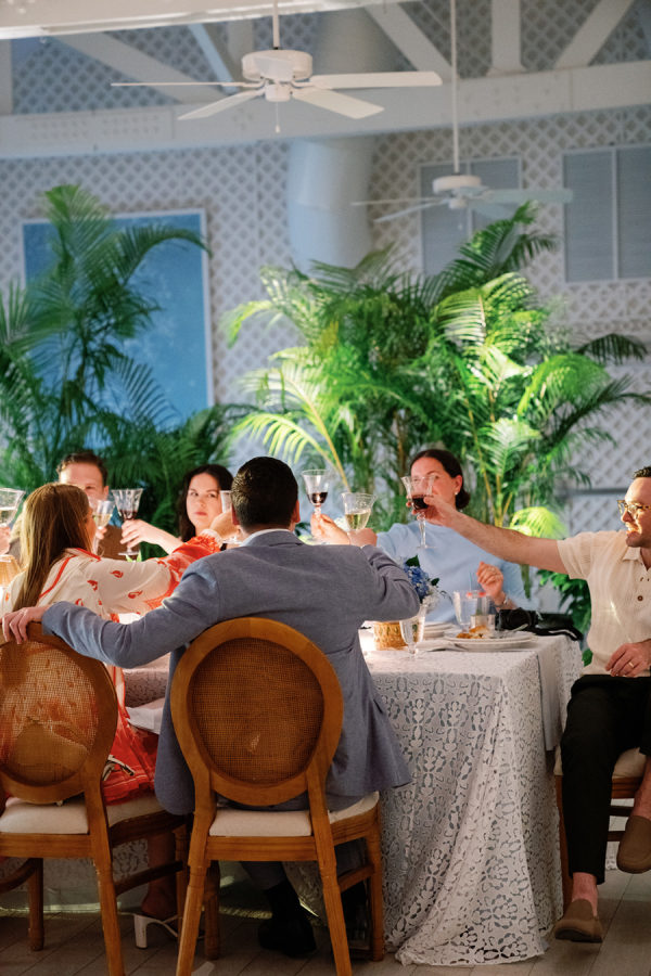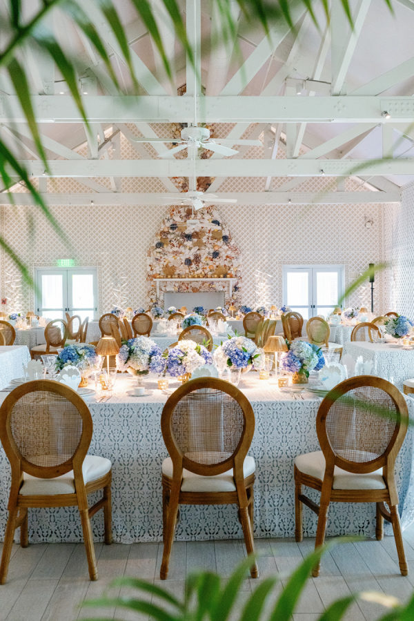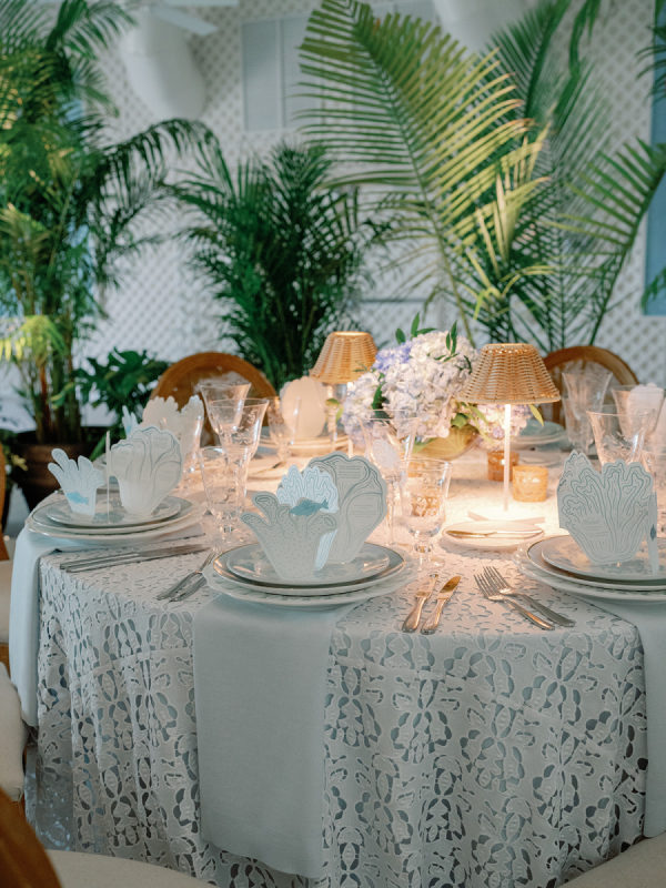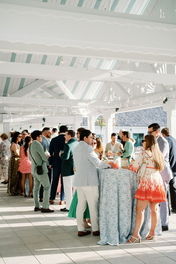 Some of Sydney’s favorite elements of classic Florida design are the playful colors and patterns—so she knew she wanted to have some fun with the wedding’s vibe, vision, and design. She tapped into the lovely chaos of the tropics, which was grounded by a strong color palette. Their welcome party, however, was a departure from that bold vision; she and Andrew intentionally went in a different design direction with soft blues and whites, paying homage to the hydrangeas that flood the bride’s hometown with summer color in the Hamptons. The decision to have very different design approaches allowed the couple’s guests to have two unique experiences on their brief trip to the island.