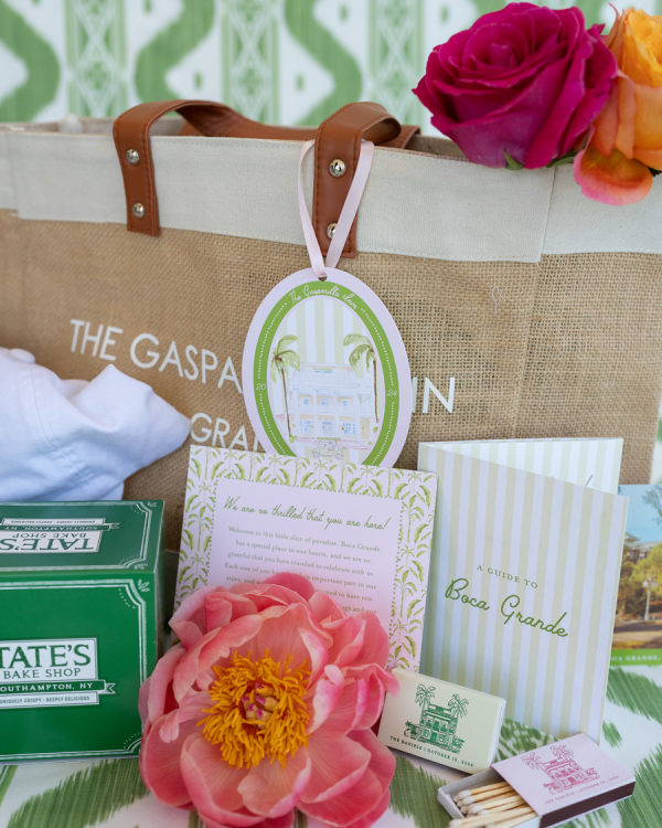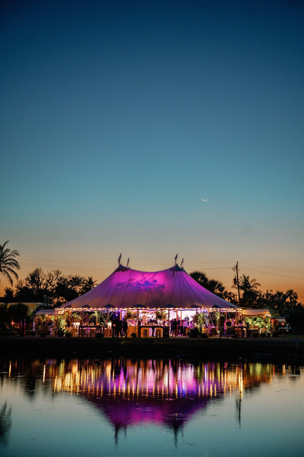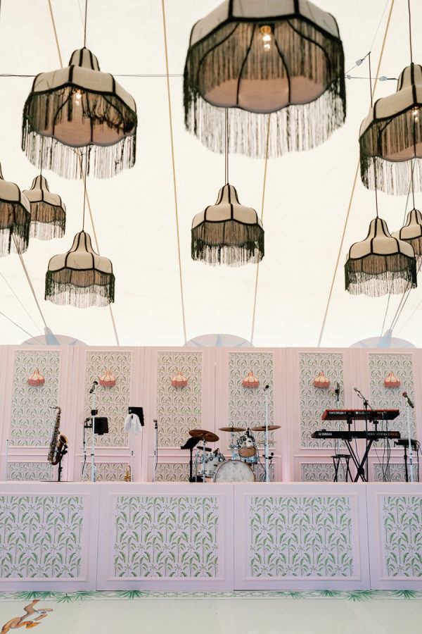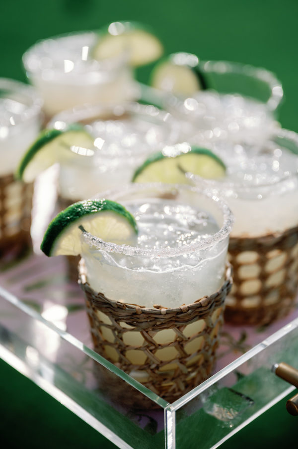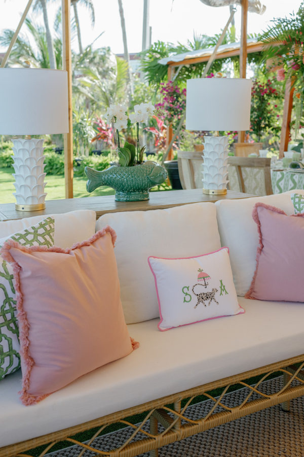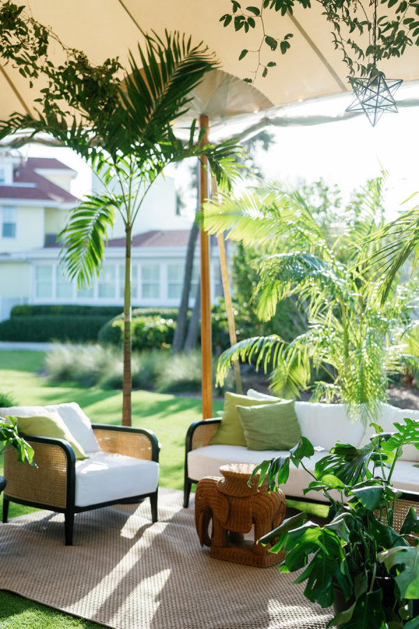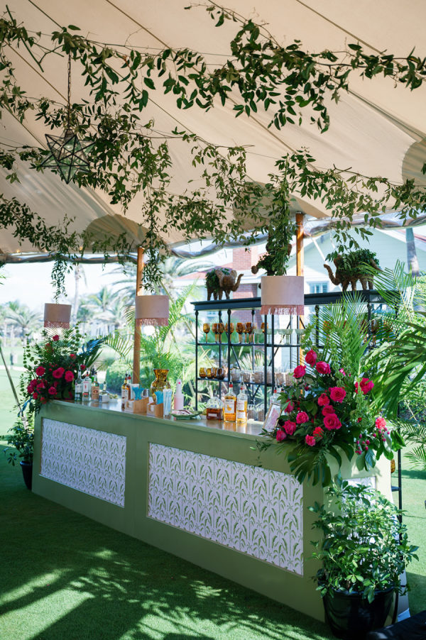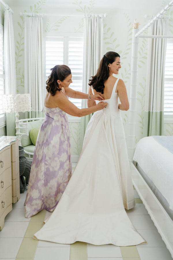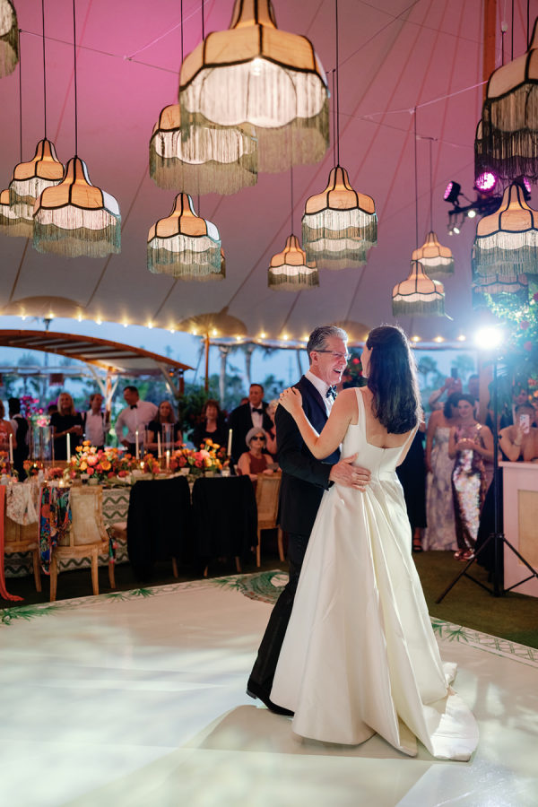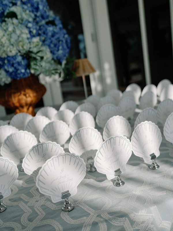 Some of Sydney’s favorite elements of classic Florida design are the playful colors and patterns—so she knew she wanted to have some fun with the wedding’s vibe, vision, and design. She tapped into the lovely chaos of the tropics, which was grounded by a strong color palette. Their welcome party, however, was a departure from that bold vision; she and Andrew intentionally went in a different design direction with soft blues and whites, paying homage to the hydrangeas that flood the bride’s hometown with summer color in the Hamptons. The decision to have very different design approaches allowed the couple’s guests to have two unique experiences on their brief trip to the island.