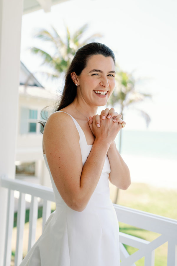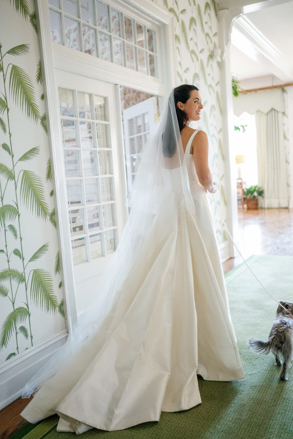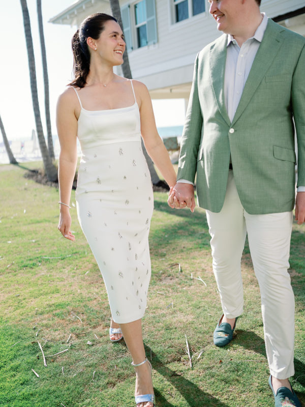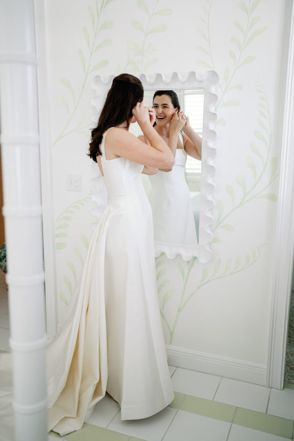 Choosing a welcome party dress was one of Sydney’s toughest style decisions. She wanted something sophisticated and timeless, but fun enough for the disco party they had planned for their guests later that evening. She ultimately found the perfect A.L.C. dress at Saks and was drawn to its length and subtle jewel embellishments. Most importantly, it was a dress she felt confident in—and one she knew was perfect for a night of dancing. A longtime vintage lover inspired by the silhouettes of the 1950s and ’60s, Sydney had admired Emilia Wickstead’s designs ever since her best friend wore one for her own wedding. By chance, she secured a last-minute appointment at a New York pop-up, arriving late but determined to try on the Ira gown she had fallen in love with from the lookbook. Despite the rushed fitting, she knew instantly it was the one. The gown’s clean, columnar silhouette and subtle retro detailing struck the perfect balance of past and present, and through a demi-bespoke process, she customized it in a lighter silk mikado for their Florida celebration. From that first appointment to two memorable visits to the London studio, Sydney felt supported by the Wickstead team and confident she had chosen a gown that would remain timeless. “When planning my wedding weekend looks, I was intentional about choosing outfits that would stand the test of time,” she says. “I want to look back in 40 years and still feel proud of the pieces I wore, knowing they reflected my personal style—not just the trends of the moment.”