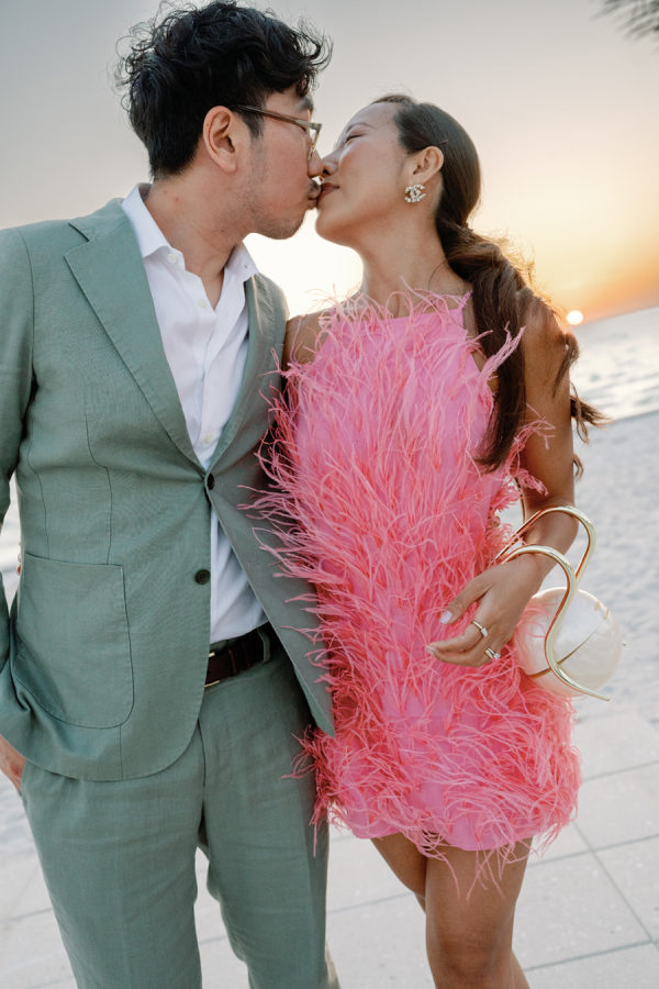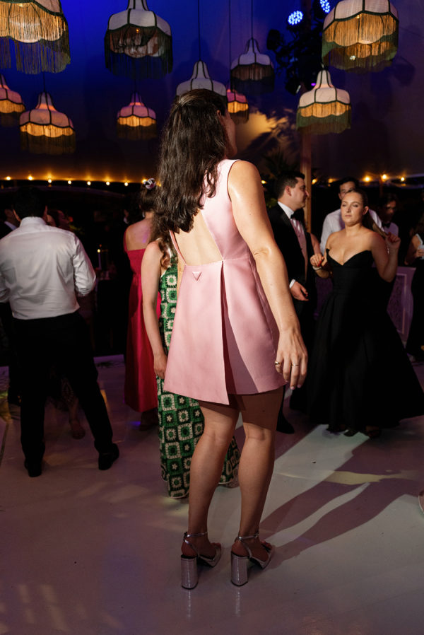 Prada has long been a brand Sydney admires for its blend of vintage-inspired design and modern edge. While searching for a late-night second look, she worked with her sales associate in New York and mentioned her love of pink. The associate immediately pulled a newly arrived Prada mini dress that struck just the right balance of playful and elegant. Though Sydney doesn’t often gravitate towards this length, the dress’ structured silhouette and high neckline felt timeless yet fresh, with a touch of vintage glamour—and by the time the reception rolled around, she was ready to step out of white and into something that felt fully her. It’s no wonder that she has plans to rewear it!