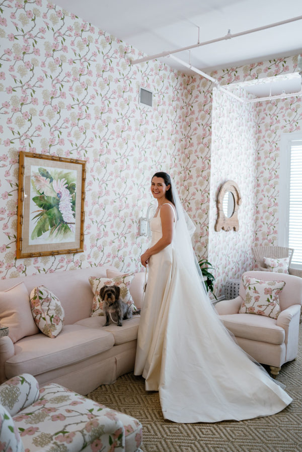 The wedding cake, crafted by the pastry chef at The Gasparilla Inn, was intentionally kept clean and classic to balance the weekend’s bold, colorful design. A simple white tiered cake adorned with fresh florals struck just the right note of elegance. The couple’s favorite detail was a custom figurine of their dog, Frida, perched on one of the tiers—a playful and personal touch that made the cake uniquely theirs. For flavor, they chose pink champagne, a celebratory nod that felt perfectly fitting for the occasion.