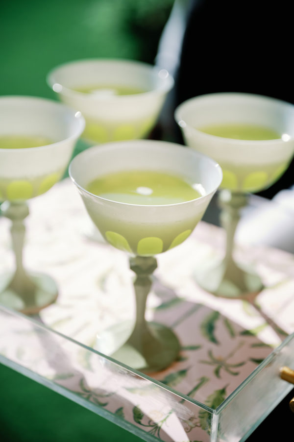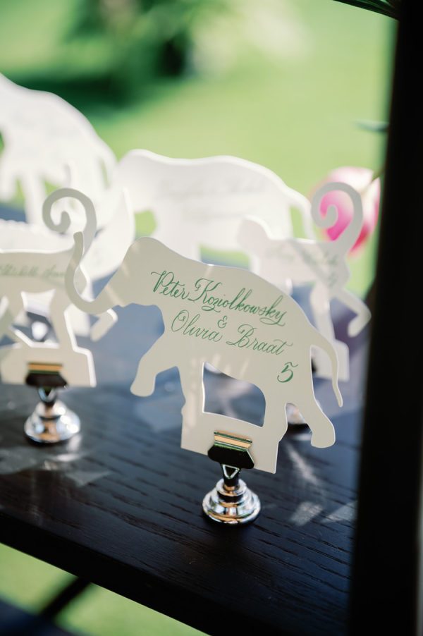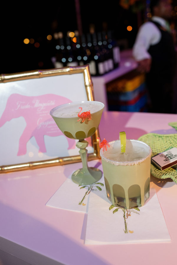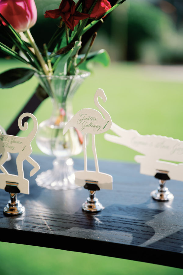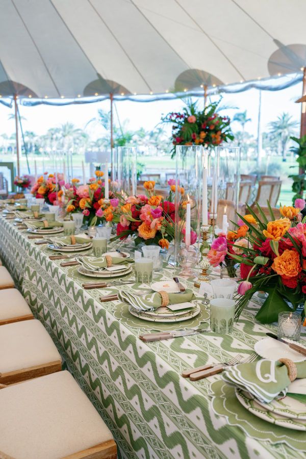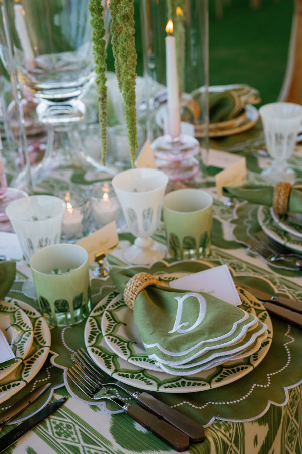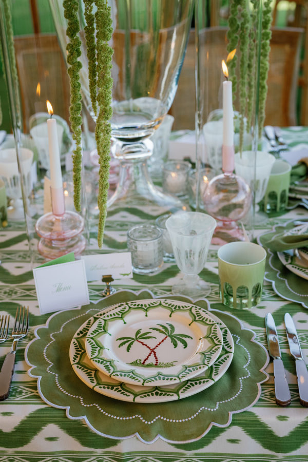 [field title=”Florals & Decor”]For Sydney, the tablescape was one of the most important design elements of the wedding. A longtime collector of vintage glassware and colorful linens, she wanted the reception design to feel bold, original, and true to her personal style. Early in the planning process, she discovered British designer Mrs. Alice and was immediately drawn to her use of color, pattern, and playful sophistication. Determined to bring that vision to life, Sydney sourced green ikat tablecloths, Jardin de Palmier plates with a tropical palm motif, rich monogrammed napkins, and whimsical green parrot candleholders—details that set the tone for a “more is more” design philosophy.
