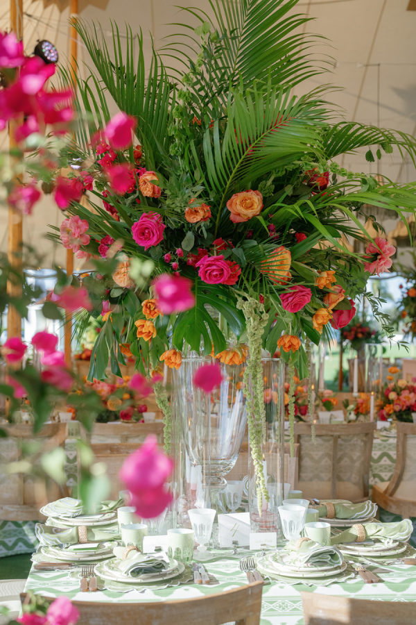 To complete the look, the couple partnered with Botanica, who created lush tropical floral arrangements that filled the room with vibrant color and texture. The result was a tablescape that felt both elevated and deeply personal, with each element later becoming part of Andrew and Sydney’s home. What began as inspiration from Mrs. Alice evolved into a design that perfectly reflected their love of layering character, color, and warmth into every detail.[/field]