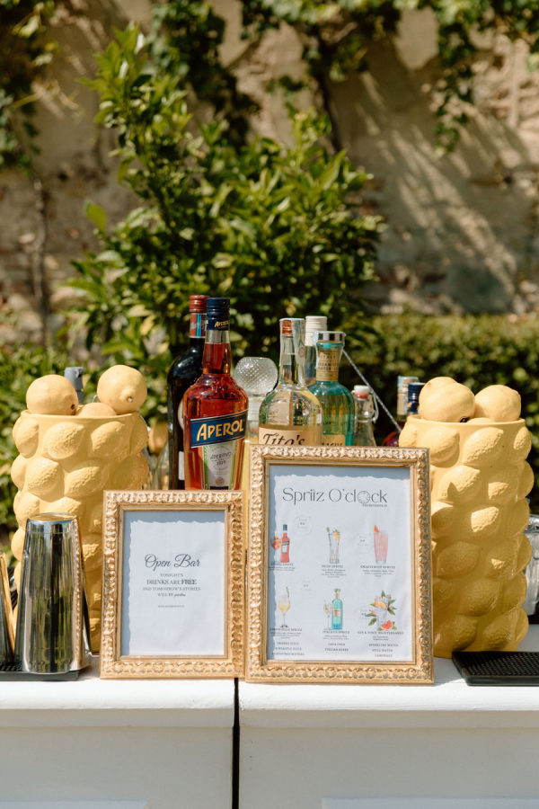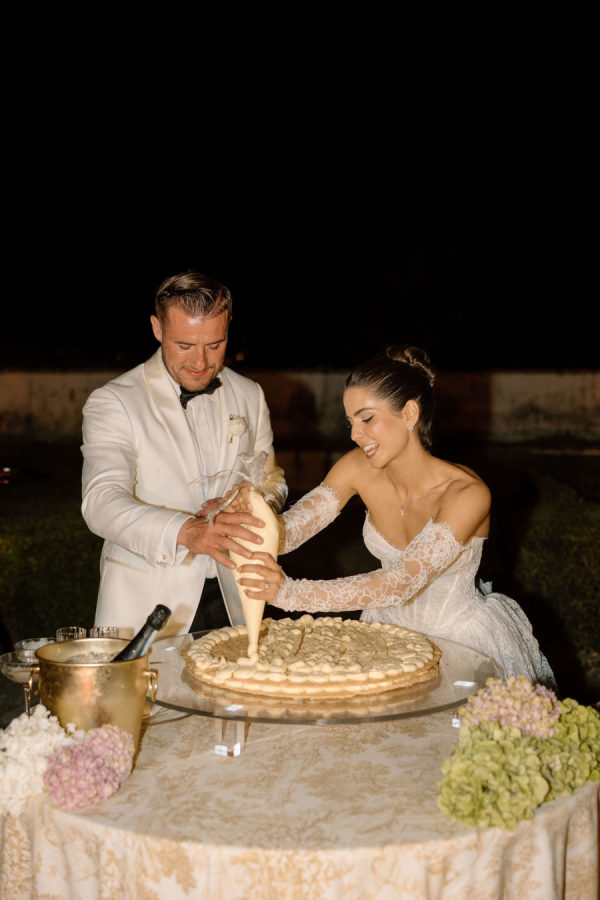 [field title=”Wedding Cake”]As with every destination wedding in Italy, all’s well that ends well — and the evening closed on a sweet high with a spectacular mille-feuille unveiled before guests. The moment was framed by a dazzling pyrotechnic display, while the glamour continued with a tiered espresso martini pyramid from Pour Events and the romantic ice-cream cart from Appertitosa, ensuring the night ended as magnificently as it began.[/field]