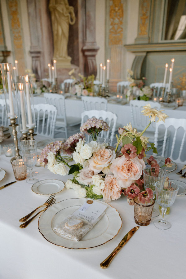 The team from Stiatti Fiori orchestrated a restrained yet striking color scheme that honored the villa’s outdoor spaces. A carpet of vintage hydrangeas and blush-toned roses framed the ceremony and aperitivo, drawing attention to the garden’s classical vistas.
