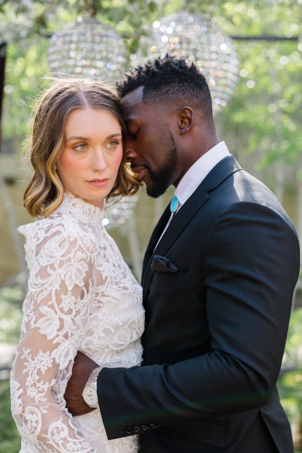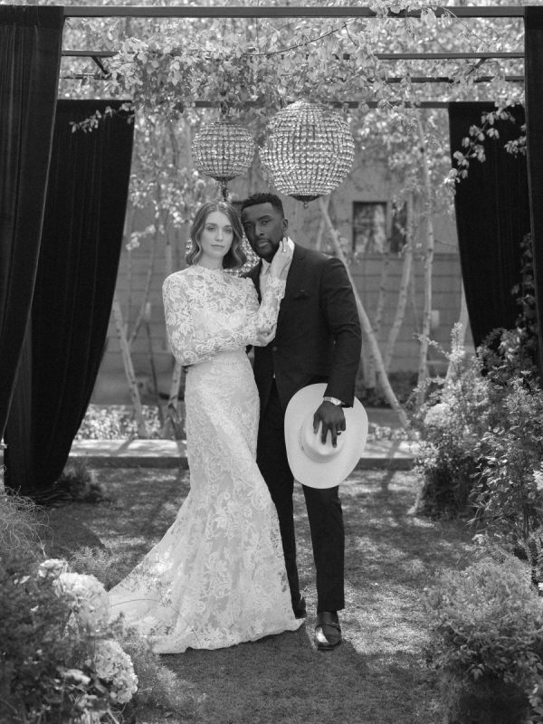 [field title=”Wedding Gown”]This editorial featured two distinct bridal gowns, each intentionally styled to evoke a different facet of modern romance. The first bride wore a high-neck, long-sleeve lace gown with delicate floral embroidery and a tailored silhouette. The gown’s vintage-inspired design and intricate detailing brought a sense of timeless elegance with a slightly ethereal edge—perfectly suited for the overgrown ceremony setting and crystal chandeliers above.