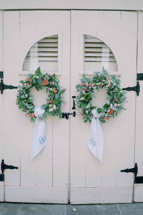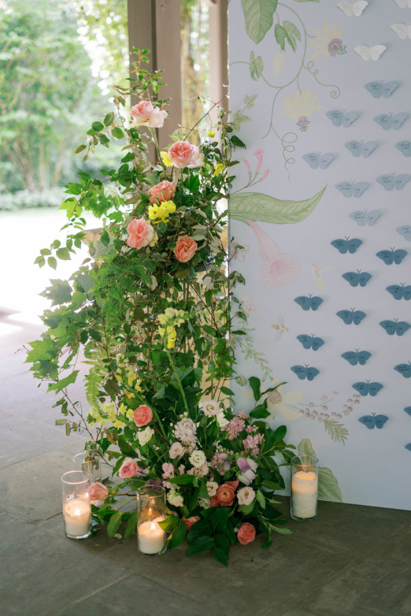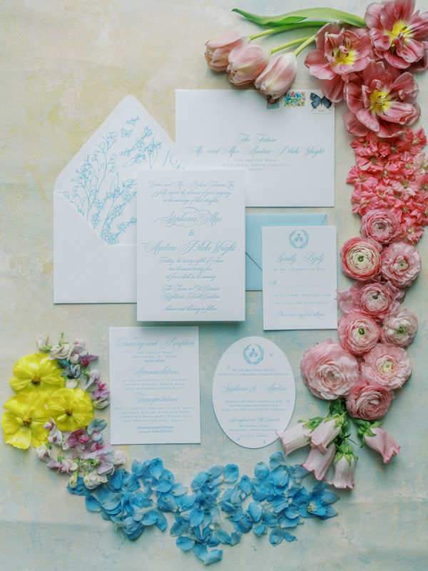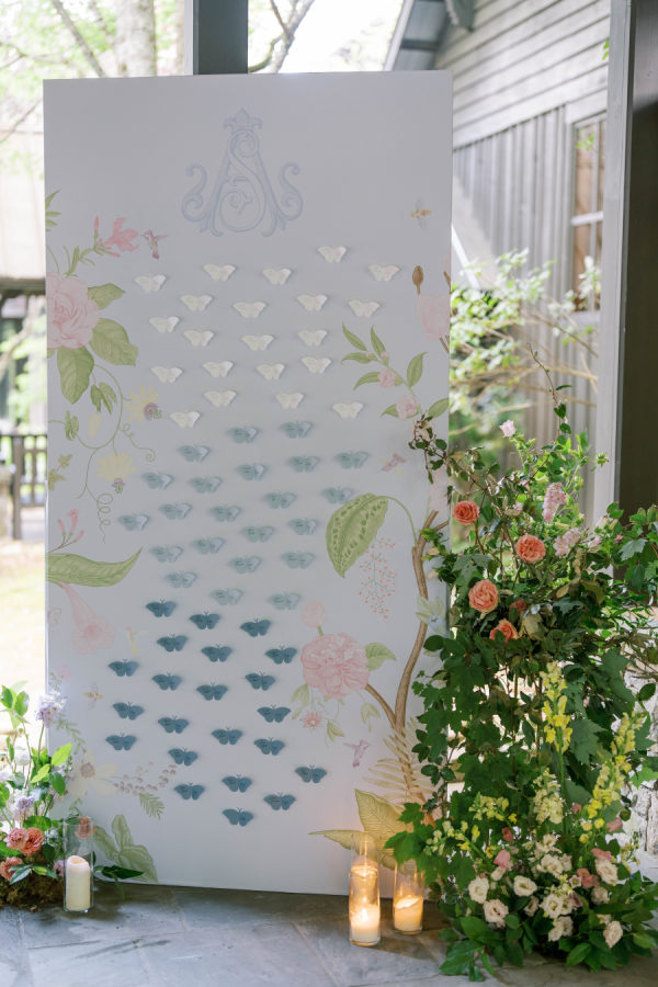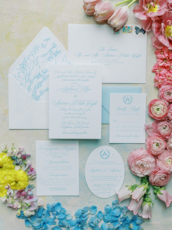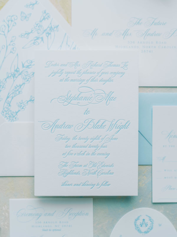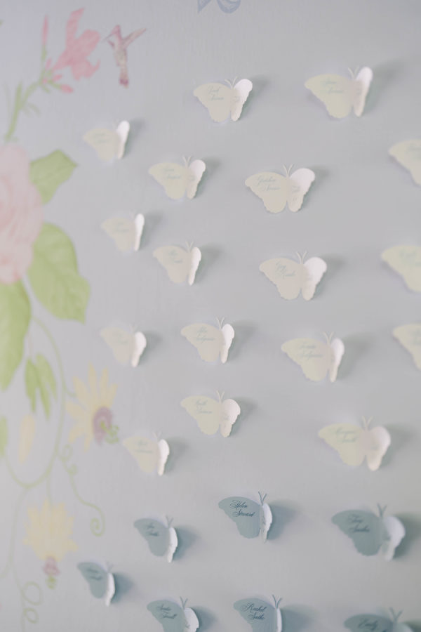 Stephanie, our bride, was the epitome of a Southern Belle, so our vision was classic and timeless with an abundance of greenery and blooms, and a touch of whimsy. A blue butterfly appeared at their engagement, so we embraced that moment as a sign to incorporate butterflies throughout the paperie, beautifully designed by Little Postage House. An escort wall adorned with the couple’s duogram greeted guests with die-cut butterflies featuring each guest’s seating assignment upon their departure from the dreamiest ceremony. The tabletop design featured blue and white woven and textural linens, scalloped chargers, and a bespoke floral and butterfly vellum overlay menu card. The focal point of the reception was a stunning chandelier with bountiful blooms and draping greenery that was lush, organic, and a true feast for the eyes.