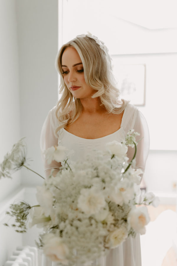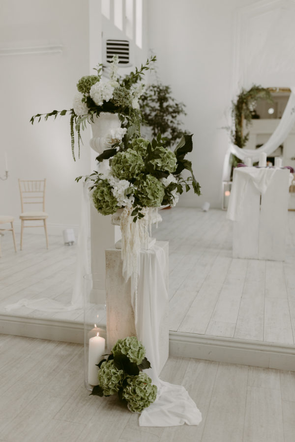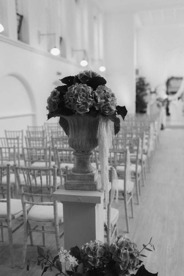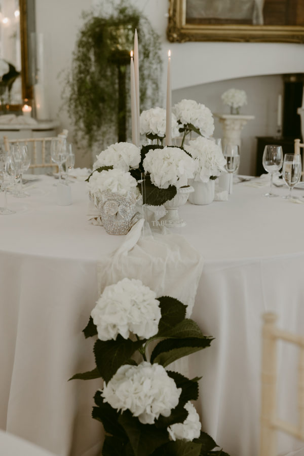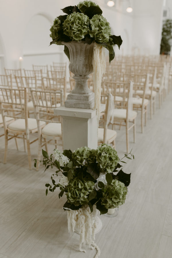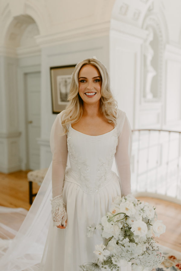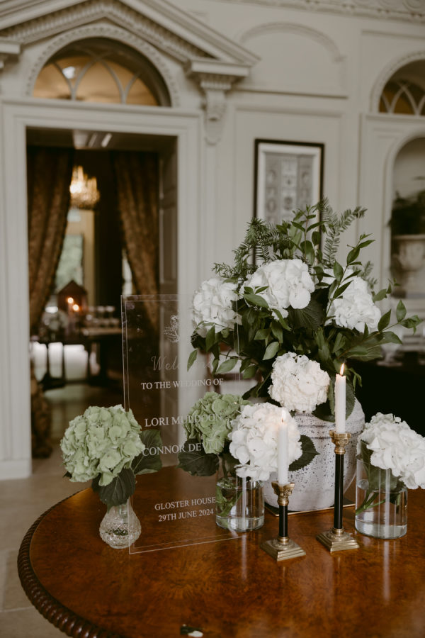 [field title=”Design / Vibe / Vision”]We instantly fell in love with our Venue Gloster House and its grounds. We knew Gloster House was already a stunning venue that spoke for itself, so we focused on enhancing its timeless charm. To complement its period features, we incorporated cascading wild hydrangeas and clean, textured stationery, adding refined yet natural touches. Connor and Lori’s love of music filled the high ceilings of Gloster House with a String Quartet playing for guests upon arrival and throughout the day.[/field]