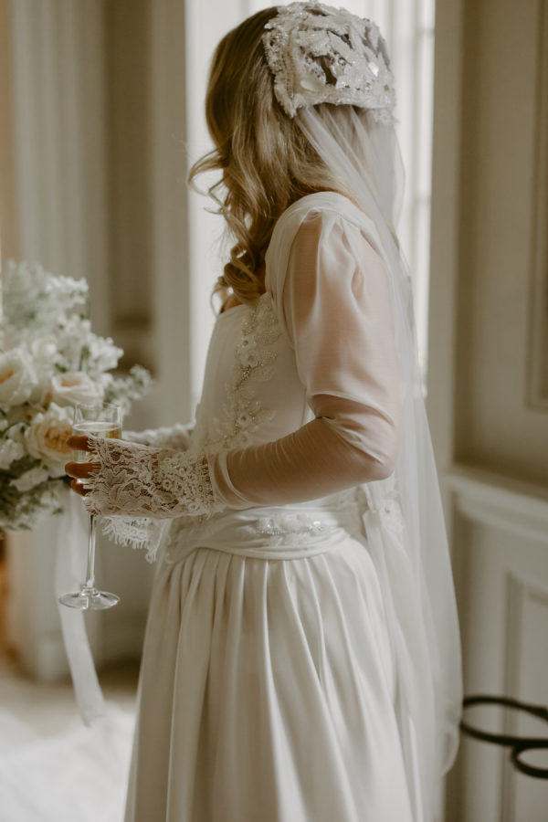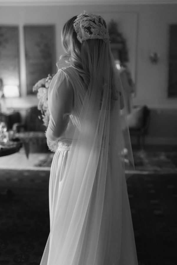 [field title=”Wedding Gown”]With Lori’s background as a bridal designer, she has always been inspired by period influences. She designed a stunning, intricate Juliette bodice, paired with an oyster satin skirt and jacket, all detailed with lace from Philadelphia. The ensemble was created in her own bridal design house in Ireland, www.lorimuldoon.com. Lori also designed and made a beautiful Cathedral veil to complete the look. Her shoes were Magda Butrym satin mules, adding the perfect finishing touch. Expertly crafted by Matthew Tanner, the period-inspired dress was everything she had ever dreamed of.[/field]
