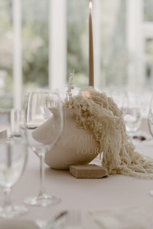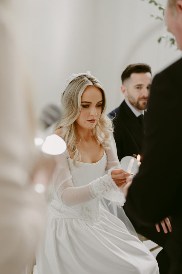 [field title=”Florals & Decor”]The florals were cascading ivory hydrangeas, a favourite of Lori’s grandmother. The decor featured a blend of textured ivory handmade papers and frayed silks, creating a sophisticated yet layered look. The styling was enhanced with tapered candles, adding a warm, romantic glow. Lori and Connor also created their own signature scent, which filled the space, making the day even more memorable. The vision was to keep everything classic, with an emphasis on rich, textured details throughout.[/field]